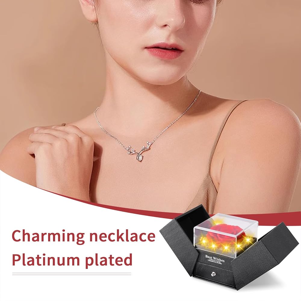 【قلادة مطلية بالبلاتين】 تحتوي هذه الوردة المحفوظة على قلادة مبهرة مطلية بالبلاتين، موضوعة بشكل خفي في صندوق المجوهرات. إنه ينتظر اكتشافها، ويعدها بإيماءة رومانسية نهائية.