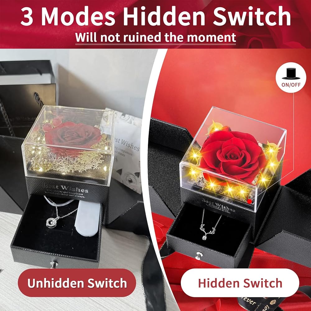 【مفتاح إضاءة محسّن】 تتميز هدية الوردة الخالدة بثلاثة أوضاع للضوء، ويتم إخفاء المفتاح بذكاء أسفل الزهور. على عكس صناديق المجوهرات التقليدية ذات المفاتيح المرئية، يحافظ تصميمنا على الجو الرومانسي عند فتح الصندوق.