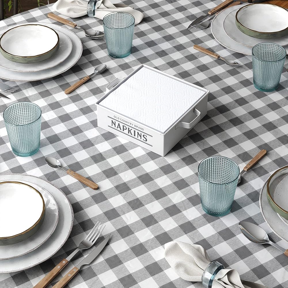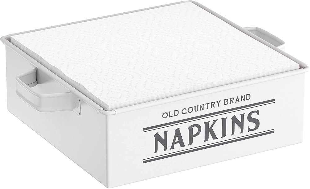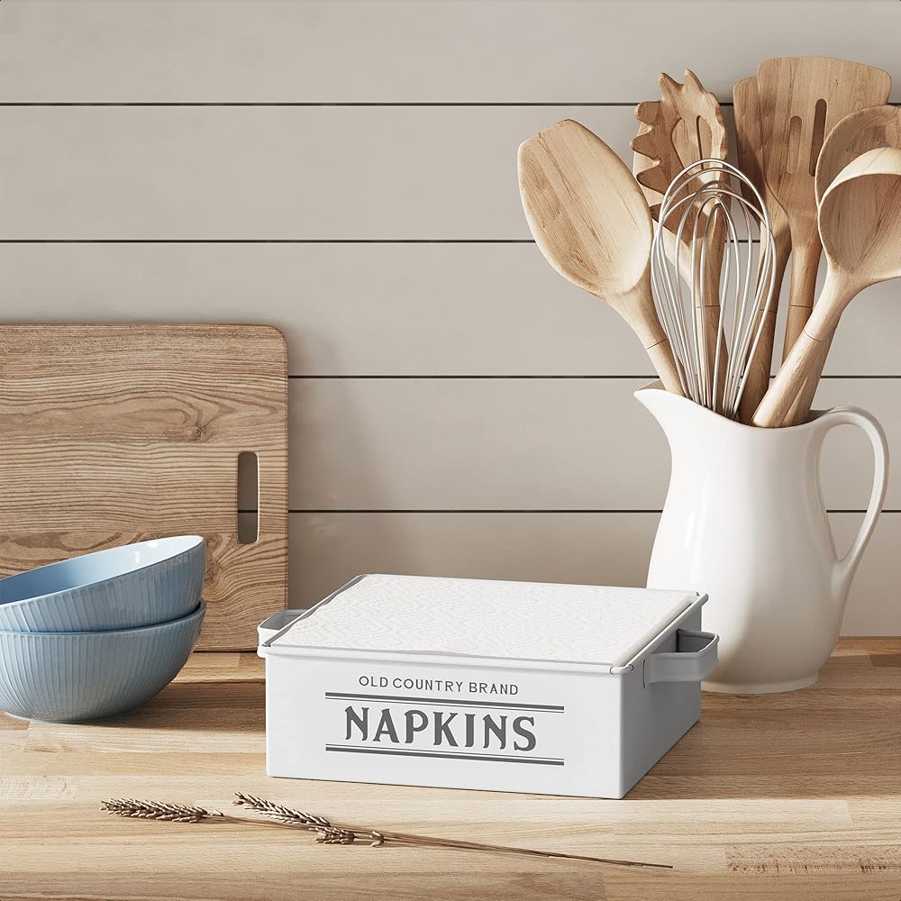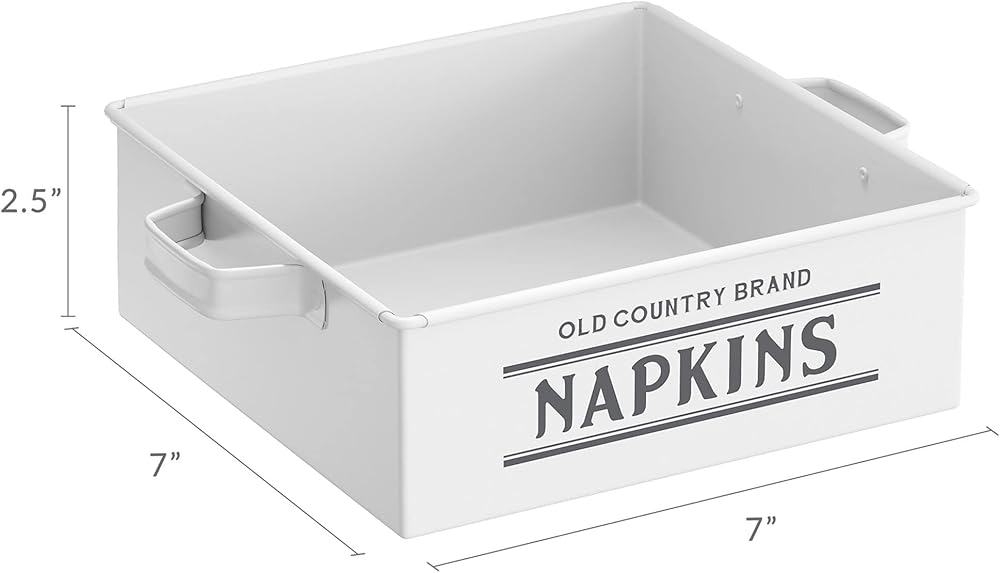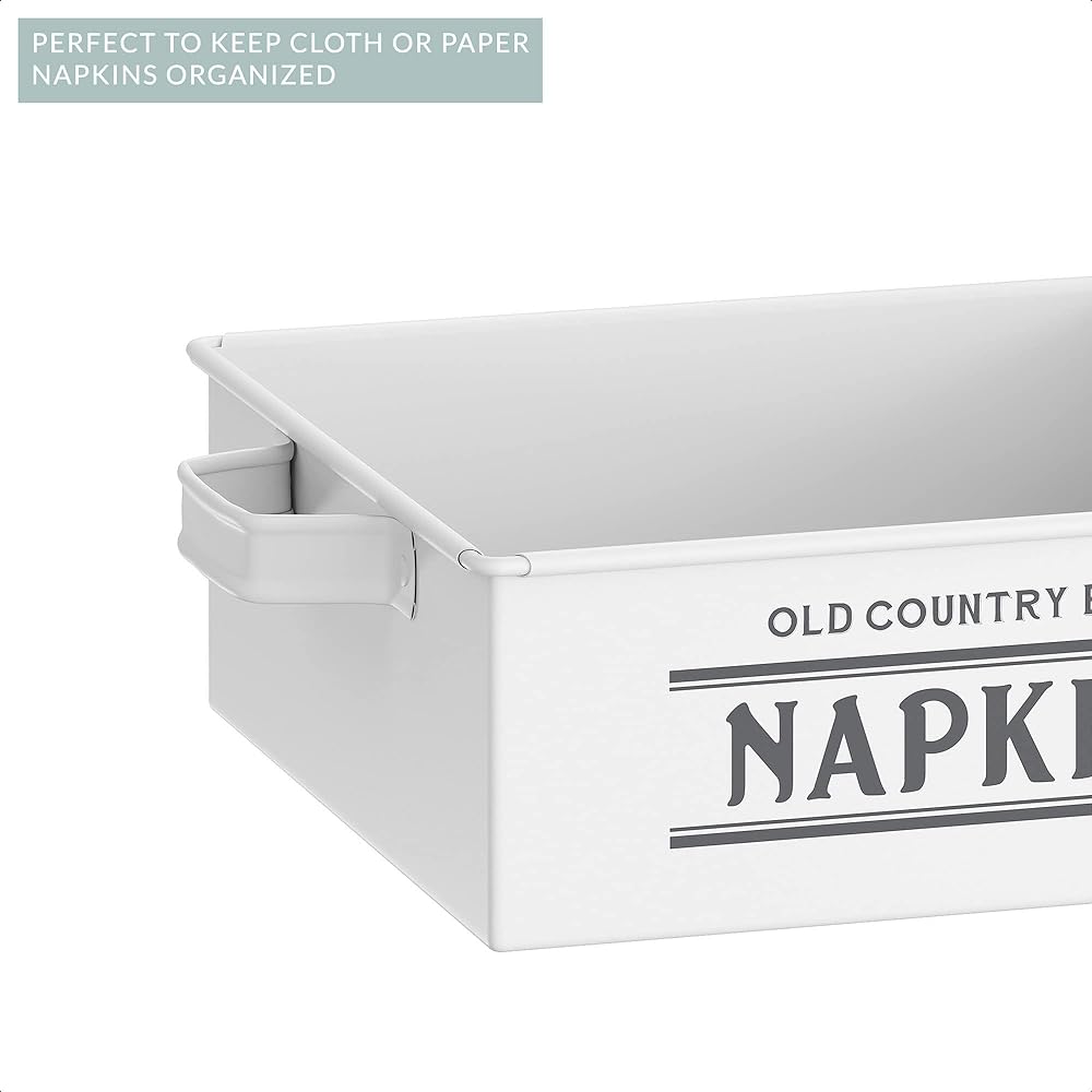 Old Country Brand Napkin Holder, White, by Barnyard Designs: Keep cloth or paper napkins organized and within reach on a tabletop or kitchen counter in our metal napkin holder for table. Rustic napkin holder farmhouse that make elegant country napkin holders for tables to hold and store your table napkins and kitchen napkins. Our vintage napkin dispenser is a stylish way to create space and declutter your kitchen counters. A distressed napkin holder look makes this kitchen napkin holder a cute farmhouse napkin holder French country that will complement your home with some farmhouse decor. These napkin holders for kitchen make an attractive kitchen table decor to a table top, dining table, or kitchen countertop. Decorate your table tops with a vintage touch with this shabby chic napkin holder. Not only are dispenser napkins a convenient solution for storing the table necessity easily at hand, the napkin holder large will keep the napkins neatly in place while making a wonderful tabletop decoration. The flat napkin holder will be a cherished gift for a house-warming party, bridal shower, wedding, and other occasions. A stylish statement, this napkin table holder will surely bring a touch of country charm to your home decor. Complete the set with our matching Old Country Brand Canister, Bread Box, and Recipe Box. Features: Dimensions: 7" x 2.5" x 7". Length with handle 8.5". Material: Galvanized Steel. Color: Body is Matte White/Logo is Pantone Cool Gray 7C. Care: Hand wash only. Not suitable for a dishwasher, microwave, or oven.