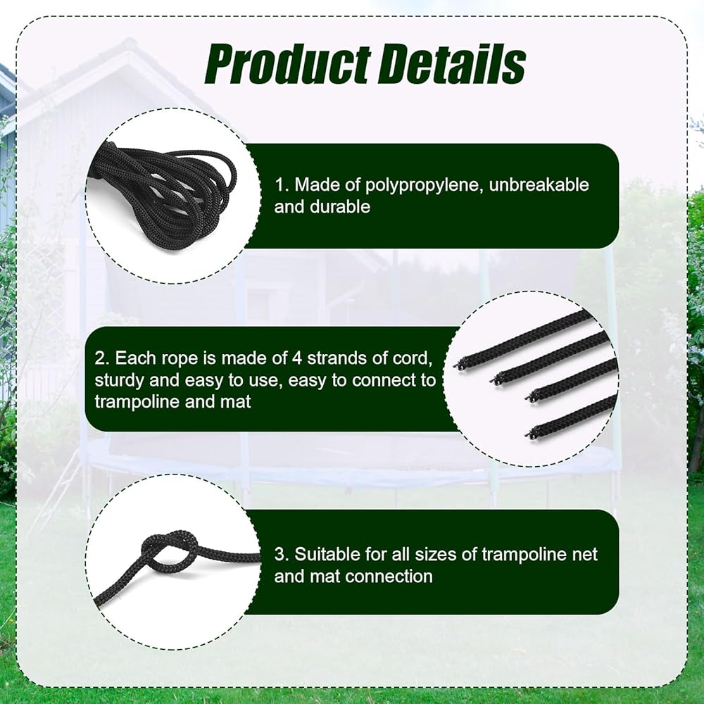 Sufficient Quantity: You will get 4 black trampoline ropes, which are sufficient in quantity, strong and reliable, meeting your daily use and replacement needs, and ensuring the safety and stability of the trampoline.