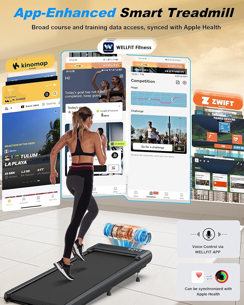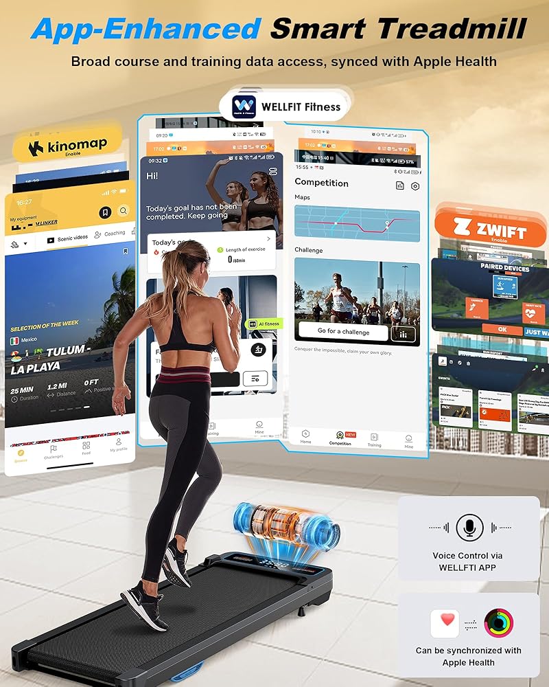 أجهزة مشي ذكية مع التطبيقات: جهاز المشي WELLFIT هذا متوافق أيضًا مع تطبيقات اللياقة البدنية الشهيرة مثل ZWIFT KINOMAP، ويمكن مزامنة جميع البيانات مع Apple Health، مما يسمح لك بالحصول على تجربة رياضية أكثر اكتمالاً في المنزل/المكتب.