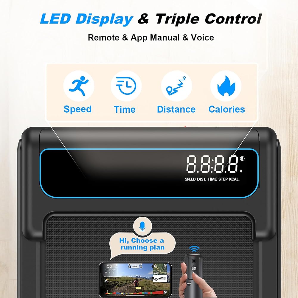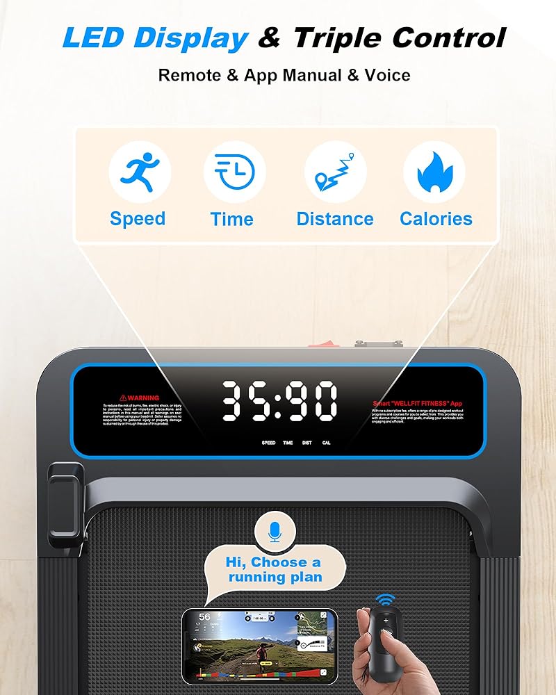 تحكم صوتي سهل للغاية: يتميز تطبيق WELLFIT بوظيفة التحكم الصوتي بالذكاء الاصطناعي. يمكنك التحكم بسلاسة في جهازك عندما تكون مشغولاً بالمشي أو الجري على جهاز المشي الموجود أسفل المكتب: "مرحبًا، أنا متعب، أبطئ السرعة!" لا توجد رسوم اشتراك مطلوبة!