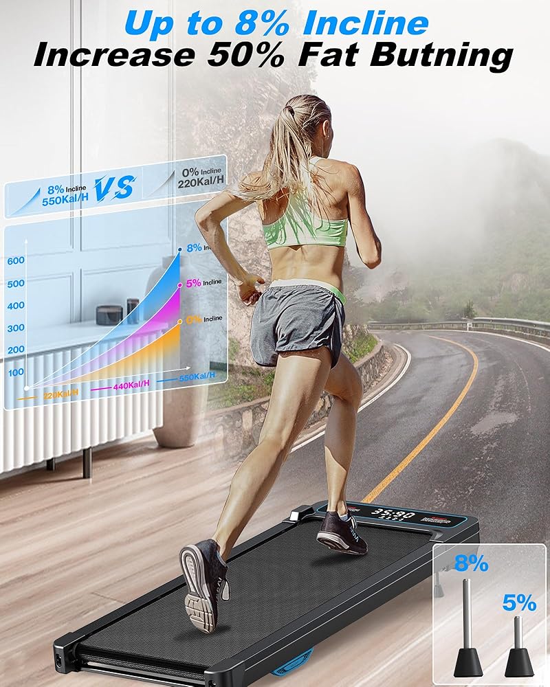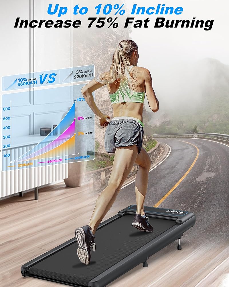 وسادة مشي مع ميل لحرق أفضل للدهون: وسادة مشي مائلة بنسبة 5% تعزز مستويات اللياقة البدنية وتعزز إمكانية حرق الدهون. سواء كنت تحاول فقدان الوزن أو البقاء نشيطًا، فهذا يتيح لك أن تكون أكثر كفاءة.