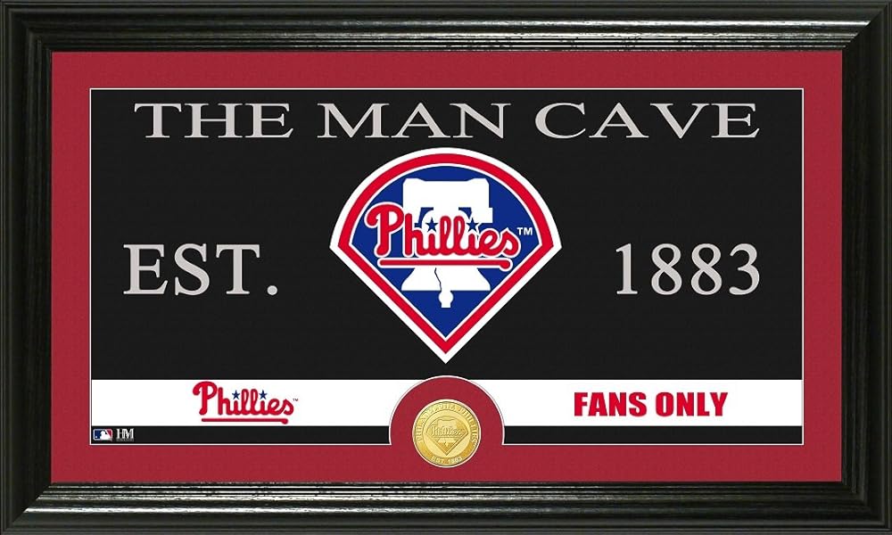 Start your Philadelphia Phillies Man Cave with our handsome Philadelphia Phillies MAN CAVE sign! This 12 x 20 plaque shows a photo of the teams logo and established date along with THE MAN CAVE written across the top, and included team coin.
