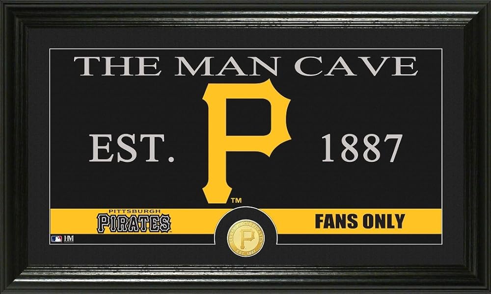 Start your Pittsburgh Pirates Man Cave with our handsome Pittsburgh Pirates MAN CAVE sign! This 12 x 20 plaque shows a photo of the teams logo and established date along with THE MAN CAVE written across the top, and included team coin.