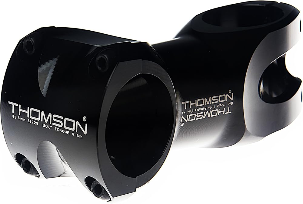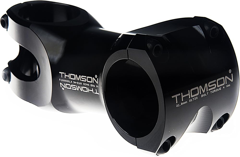 The Thomson X4 Stem is stronger and lighter than their older Elite stem. A good part of this weight savings comes from the change in design. Where the Elite used an internal wedge clamp, this X4 relies on a more traditional split clamp for the steerer interface. While it meant losing the knee-saving shape on the Elite, the clamp bolts are pretty minimal given the sculpted design. The Thomson X4 Stem is CNC machined from 7000 series aluminum alloy. It has a 31.8mm clamp diameter. It's available in Black or Silver and with a zero (90) or ten (100) degree rise.