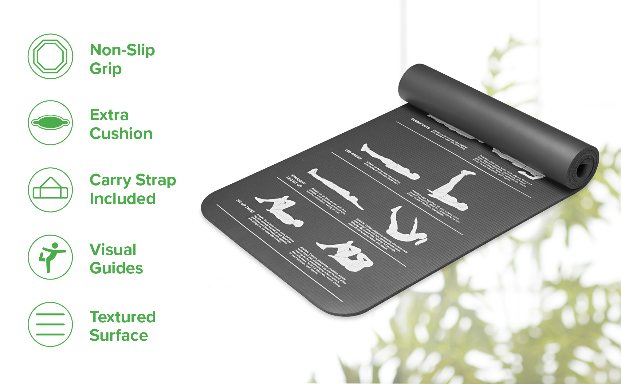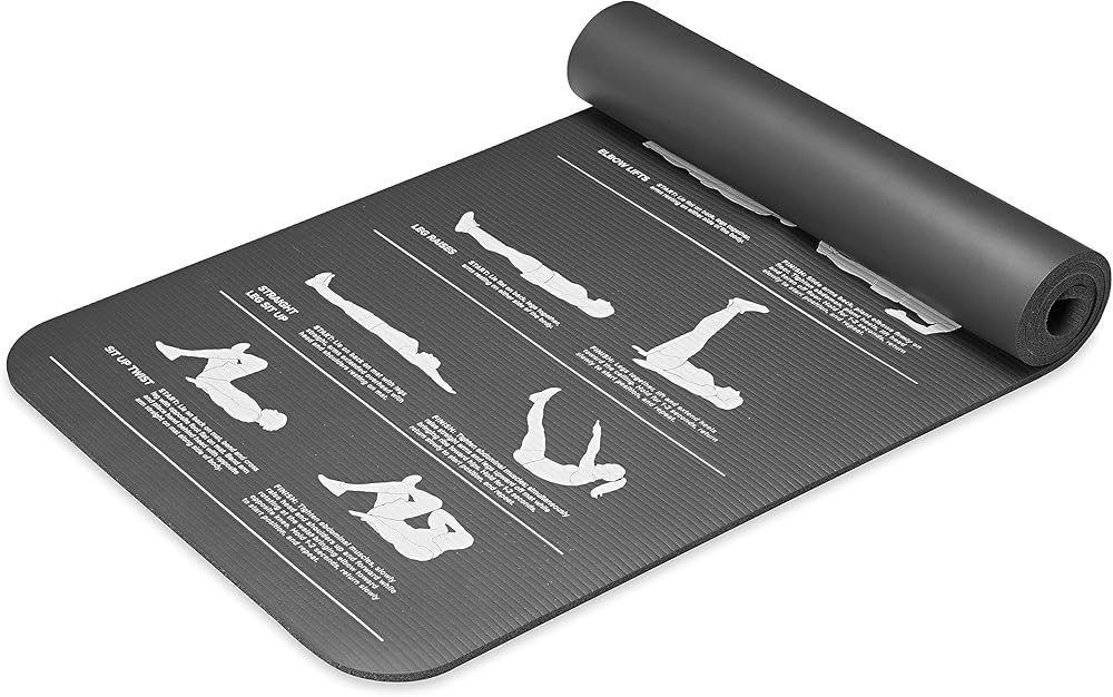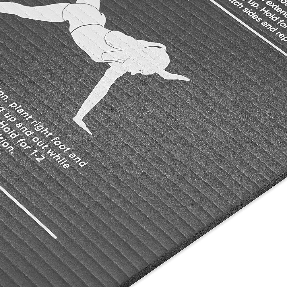 Visual Guides - Our home gym mat includes an easy-to-follow visual guide directly on the mat to give you direction and ideas for how you can stretch based on your goals. Guides include leg raises, straight leg sit-ups, and twisting while sitting up.
