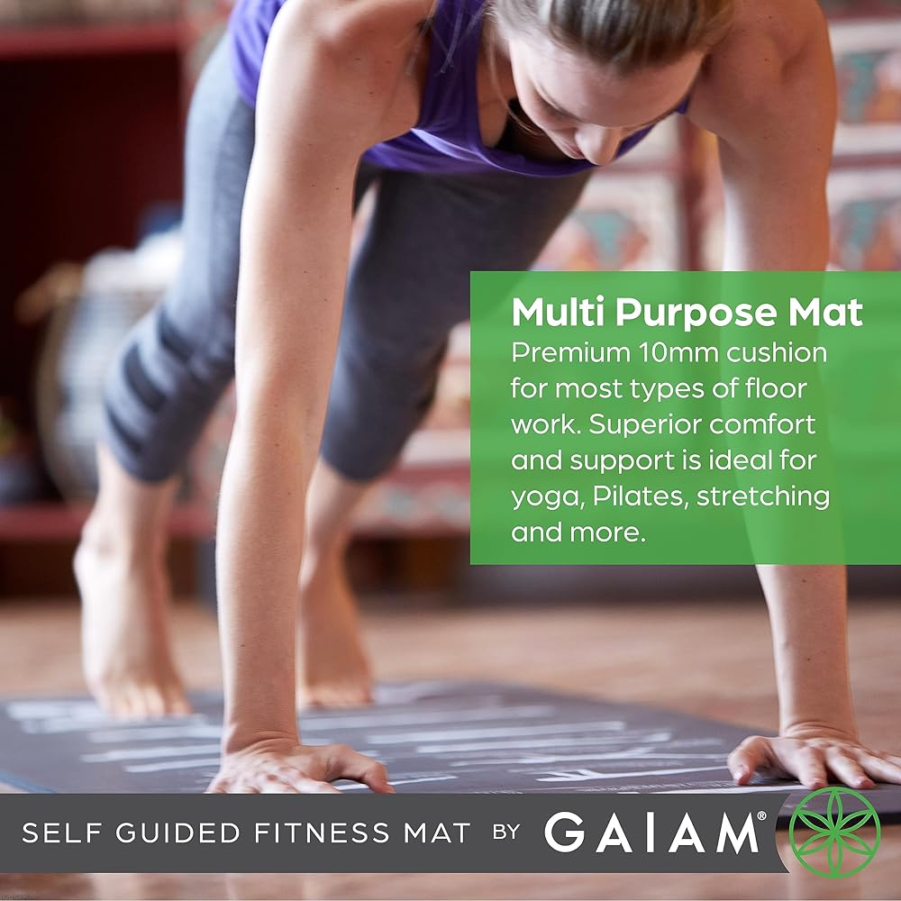 The Gaiam 10mm multipurpose yoga mat is extra thick for optimal comfort and is great for all types of floor workouts including yoga, Pilates, stretching, and general exercise. The extra thick mat supports all types of routines. Our home gym mat includes an easy-to-follow visual guide directly on the mat to give you direction and ideas for how you can stretch based on your goals. Guides include leg raises, straight leg sit-ups, and twisting while sitting up. Our thick yoga mat includes a carrying strap for on-the-go fitness as well as everyday workouts for your home gym. It is a great essentials gift for introducing yoga into your life. This non slip yoga mat features a textured non-slip surface for better grip and balance while it helps to provide strong traction so you can pose with confidence while receiving cushioning and support. Our padded yoga mat measures 72"L x 24"W x 10mm thick. The included carrying strap can be removed from the mat when not transported.