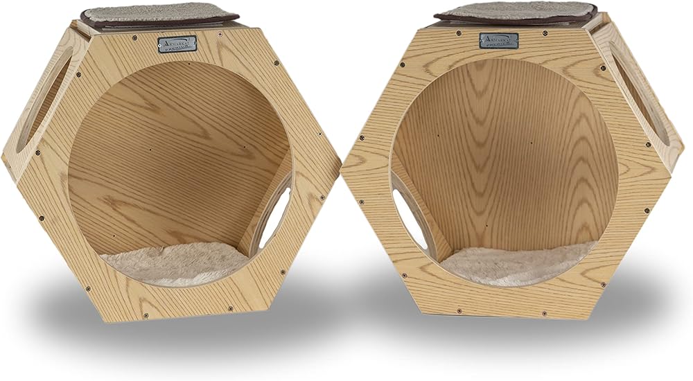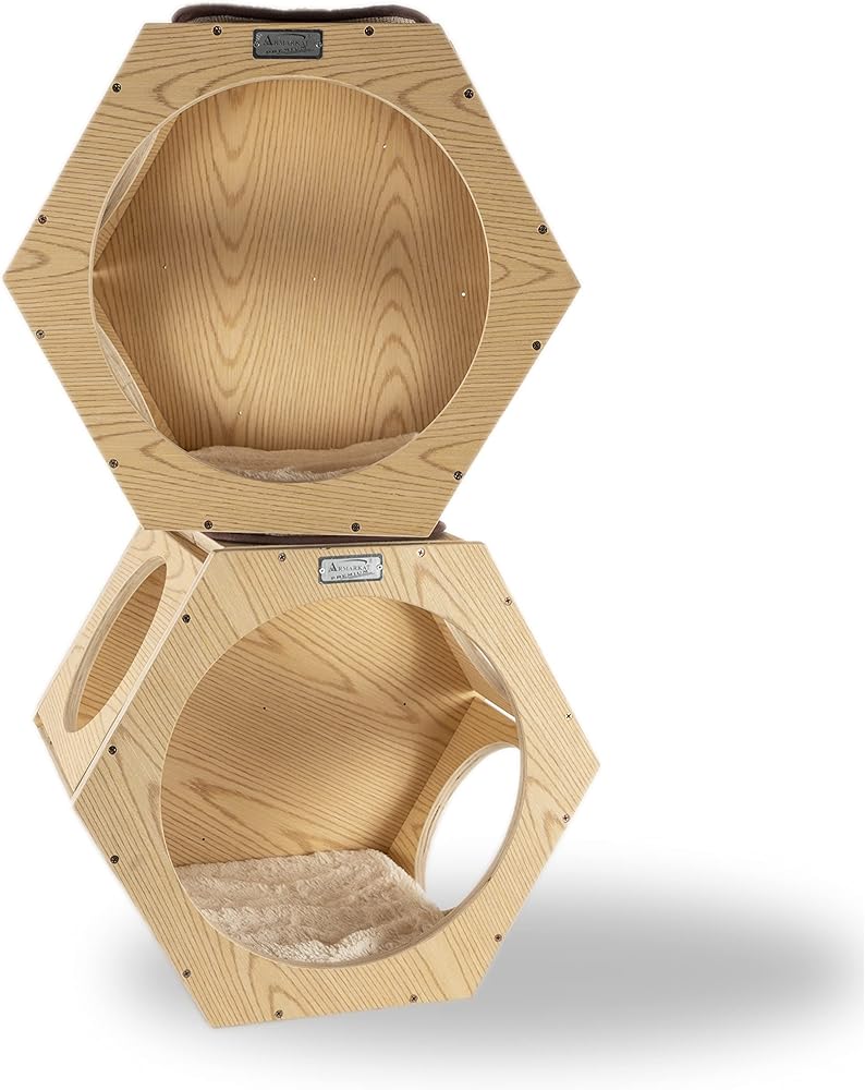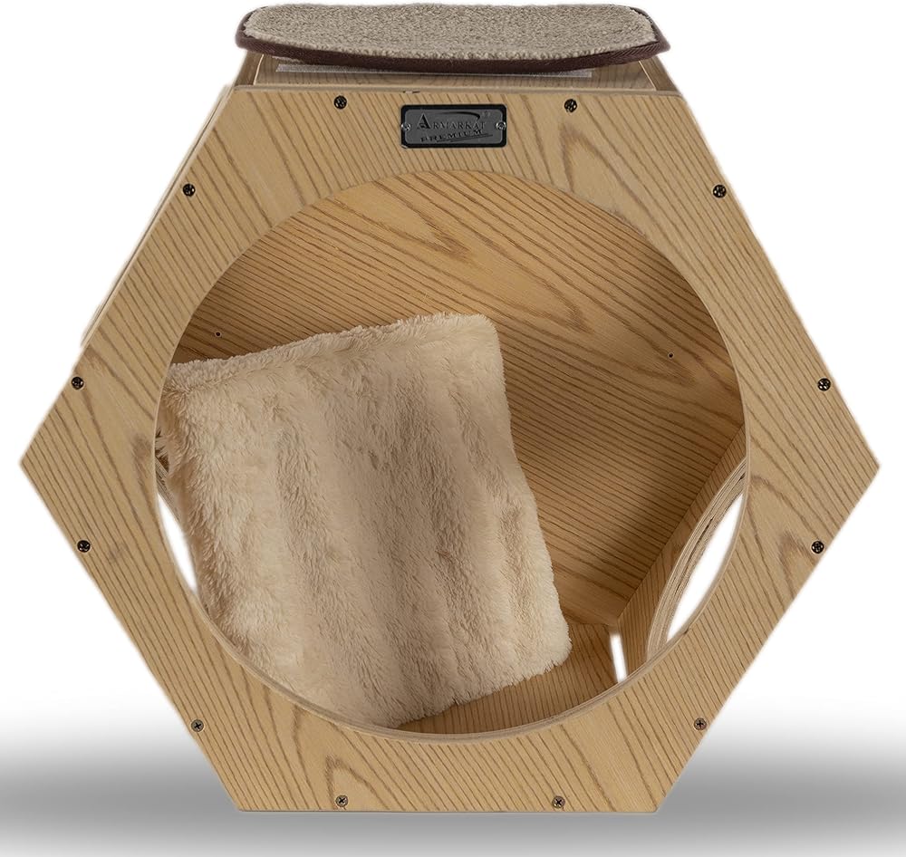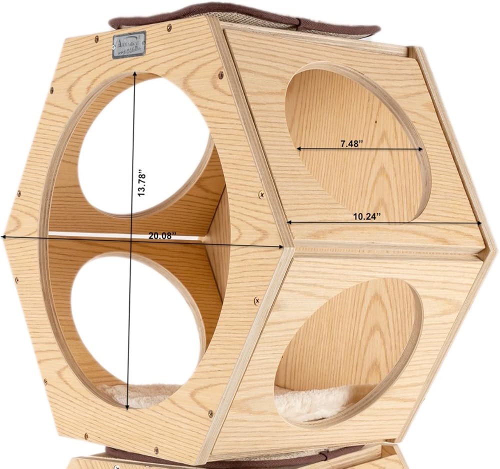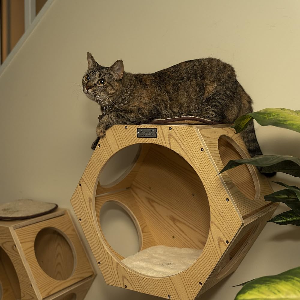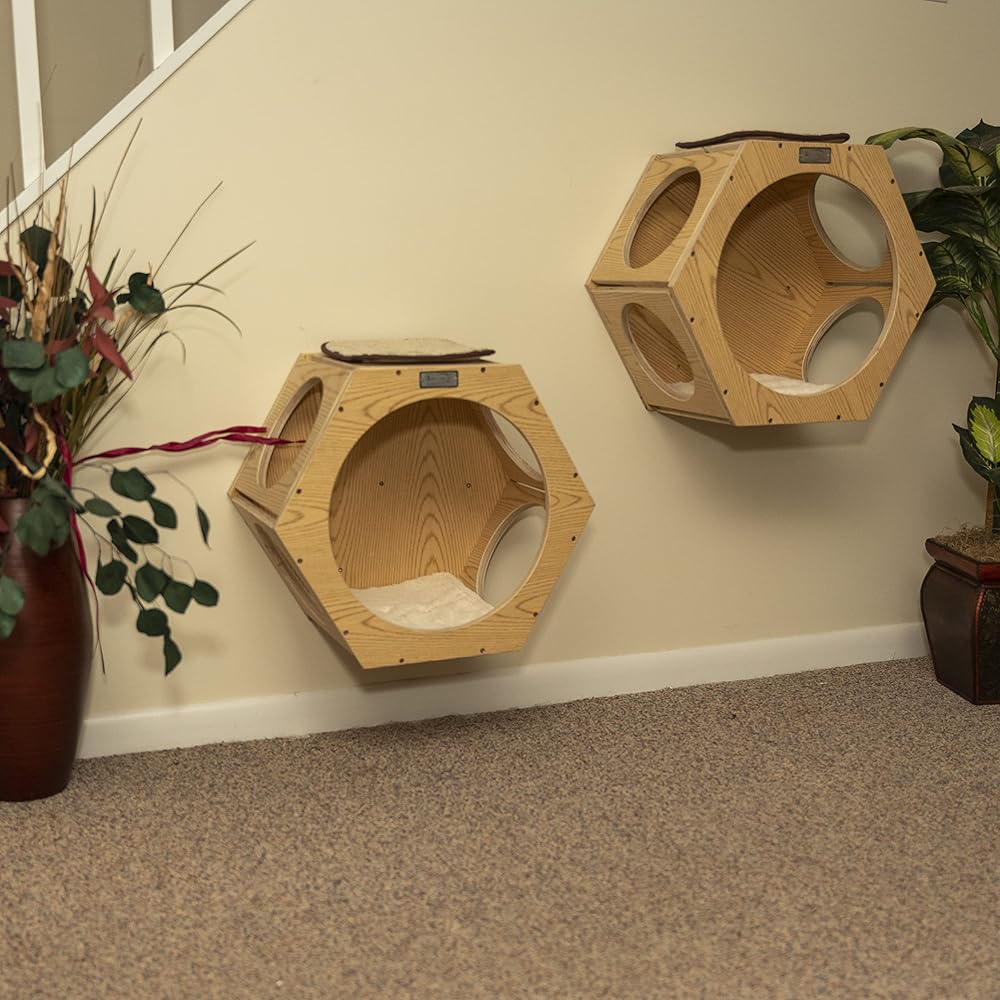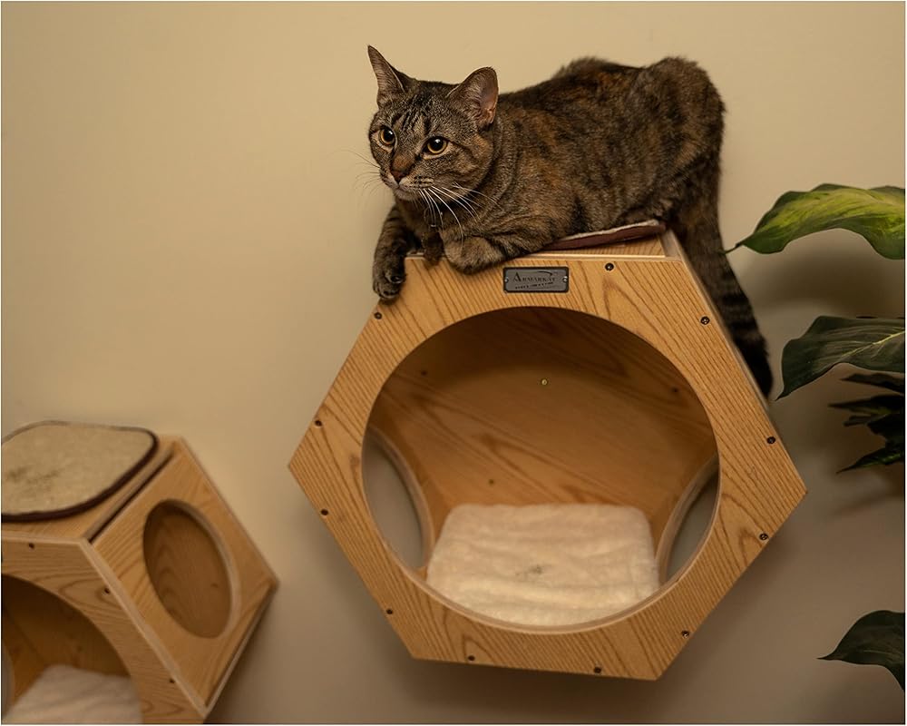 These wall tree additions are perfect for mounting on the wall for your cat. They are made from solid poplar multilayered board with a naturally variegated surface. The durable wood surface makes these additions highly cat-friendly. The good looks of these wooden wall pieces make them unobtrusive, blending with your decor, and an elegant addition to the wall. With these cat shelves, your cats can climb up high, letting their instincts drive them to sleep high up where they feel most safe. The openings on these wall tree additions provide excellent air circulation while your cat is resting. The flat surface on the top provides yet another place to perch and sleep. This set is great for homes with multiple cats, providing various sleeping spaces. With Armarkat wall series, the sky is the limite. You can fully leverage your imaginations to create a comfortable space for your furry friends and you. Measurements: Full Unit: 20" (L) x 12" (W) x 18" (H) Base: 10" (L) x 12" (W) Front Hole Diameter: 14" Side Hole Diameter: 7.5" Gross Weight: 15.4 lbs. Net Weight: 14.1 lbs. Package Dimensions: 17.5" (L) x 6.3" (W) x 20.5" (H)