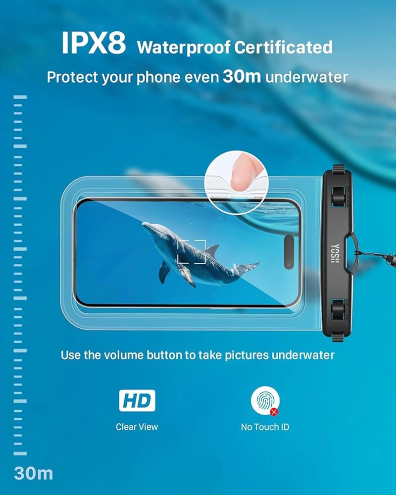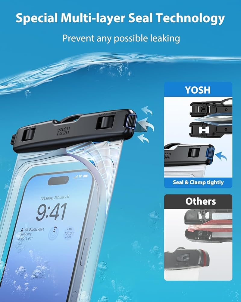 🏄 [YOSH Special Double Seal Tech] Different from others, YOSH waterproof cases own this whole new snap-and-lock seal clip and fully enclosed black edge, which can constantly protect your cell phone from water invader well. The maximum waterproof protection is up to a water depth of 30 meters(100ft).