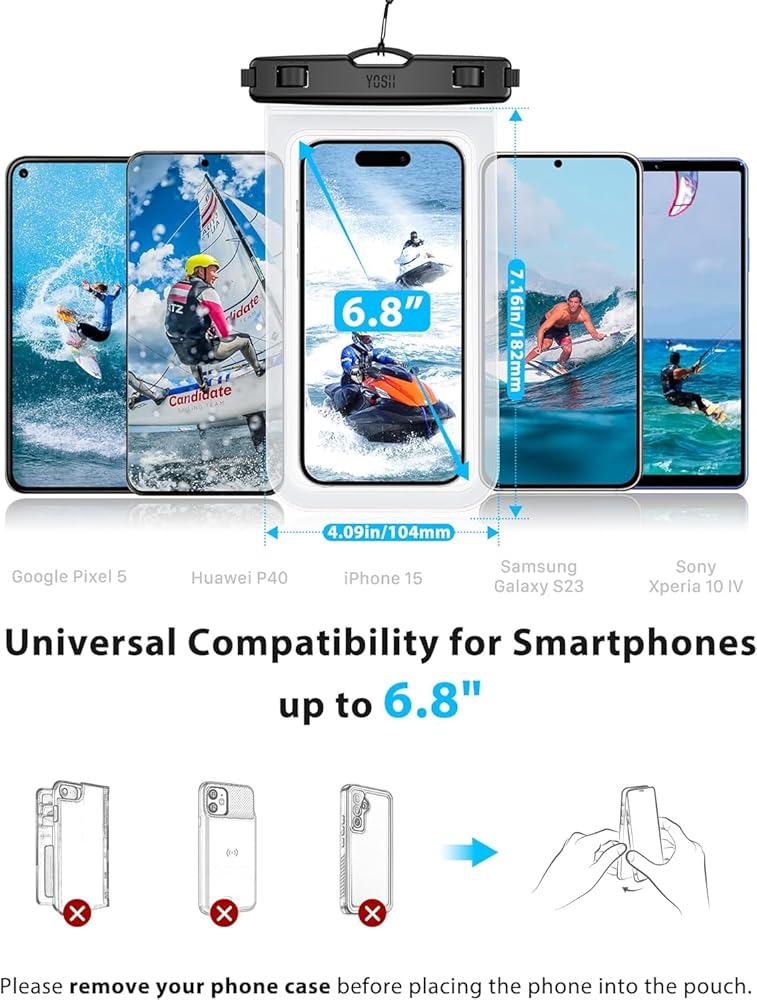 🏄 [Wide Compatibility] YOSH Waterproof Phone Case is your must have travel essentials/holiday essentials! Compatible for phones up to 6.8 inches, such as iPhone 15 14 Pro 15 14 13 12 11 XS XR X 8 7 6s Plus one plus 8 pro Samsung S24 S23 S22 S21 S20 S10+ S10 S9 S8, Huawei P60 P50 P40 P30 P20 Pro Mate 60 30 20 Xiaomi, Oppo. Ieal for beach, swimming, rafting, surfing, fishing, sailing, diving, boating, canoeing, kayaking, snorkeling, skiing, water sports, hiking, camping, bath, spa, travel, and other various indoor & outdoor activities as a portable travel /holiday accessories.