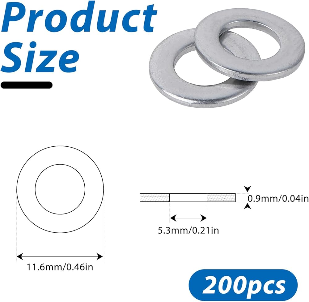 Product specifications - The inner diameter of the flat washers is 5.3mm/0.21 inches, the outer diameter is 11.6mm/0.46 inches, and the thickness is 0.9mm/0.035 inches.