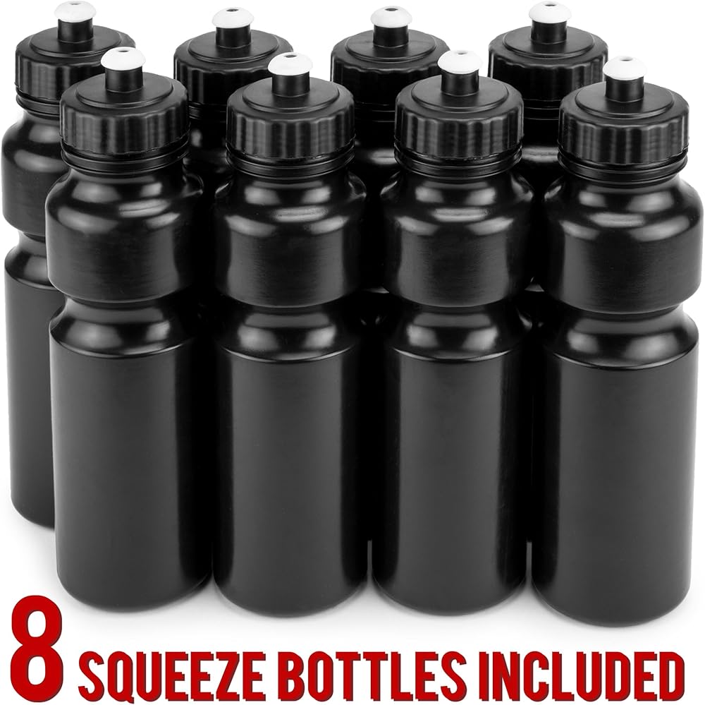 Keep the team hydrated on or off the field with this convenient set of eight plastic sports bottles and travel carrier. Lightweight, portable, and easy to carry with a comfortable grip, this drink carrier is made with durable plastic and folds up for easy storage. All bottles are secured with a screw top cap and pop-up spout for minimal spillage and are dishwasher safe and recyclable.