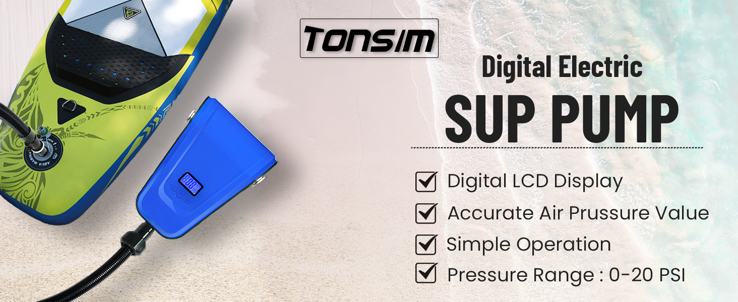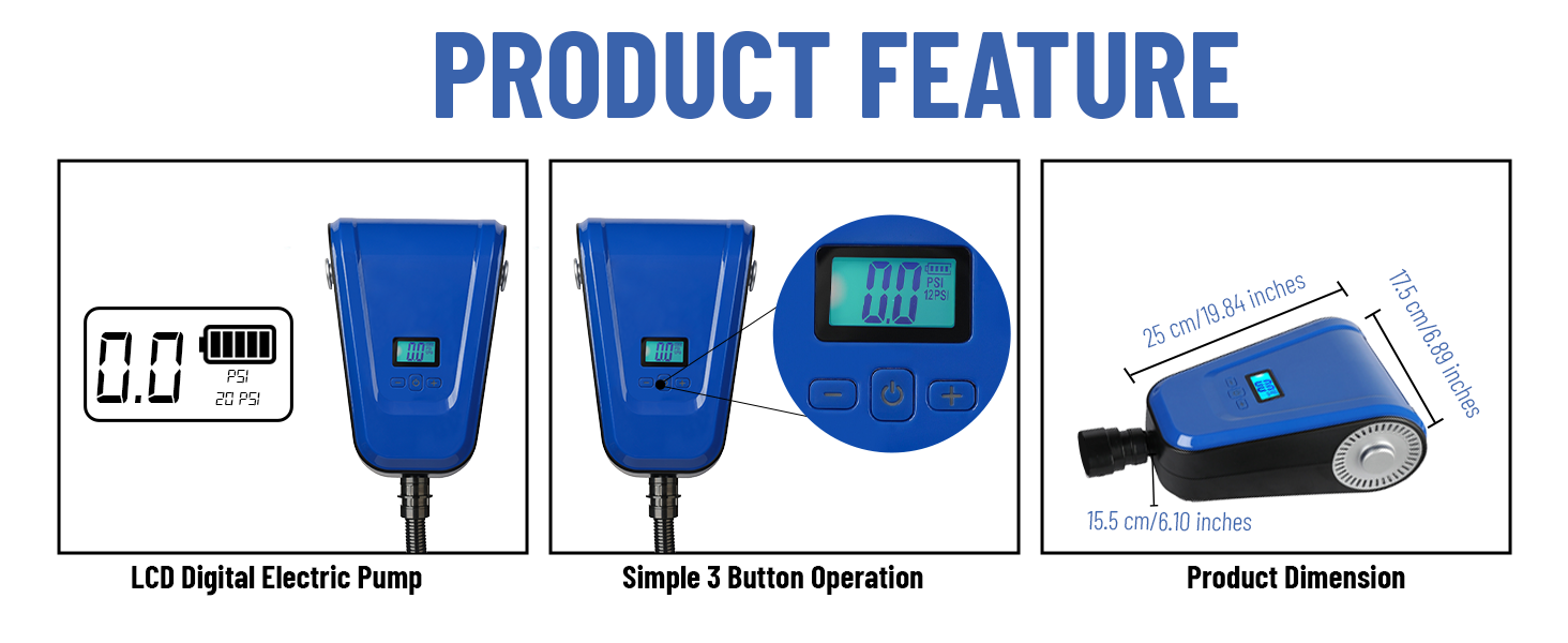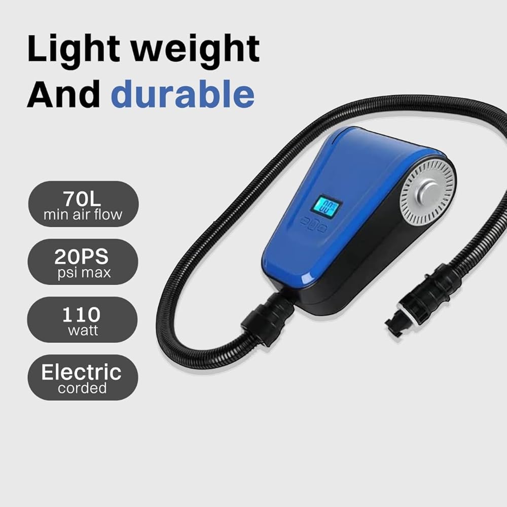 شاشة رقمية مع مراقبة الضغط: استخدم الشاشة الرقمية لمضخة SUP لضبط الضغط المطلوب ومراقبة الضغط في الوقت الحقيقي. نطاق العمل المدعوم بمضخة SUP هو 12PSI/16PSI/20PSI، مقياس الضغط هو ±0.5 PSI. يمكن أن يصل تدفق الهواء إلى 70 لتر/دقيقة. ضجيج مضخة SUP أقل من 85 ديسيبل.