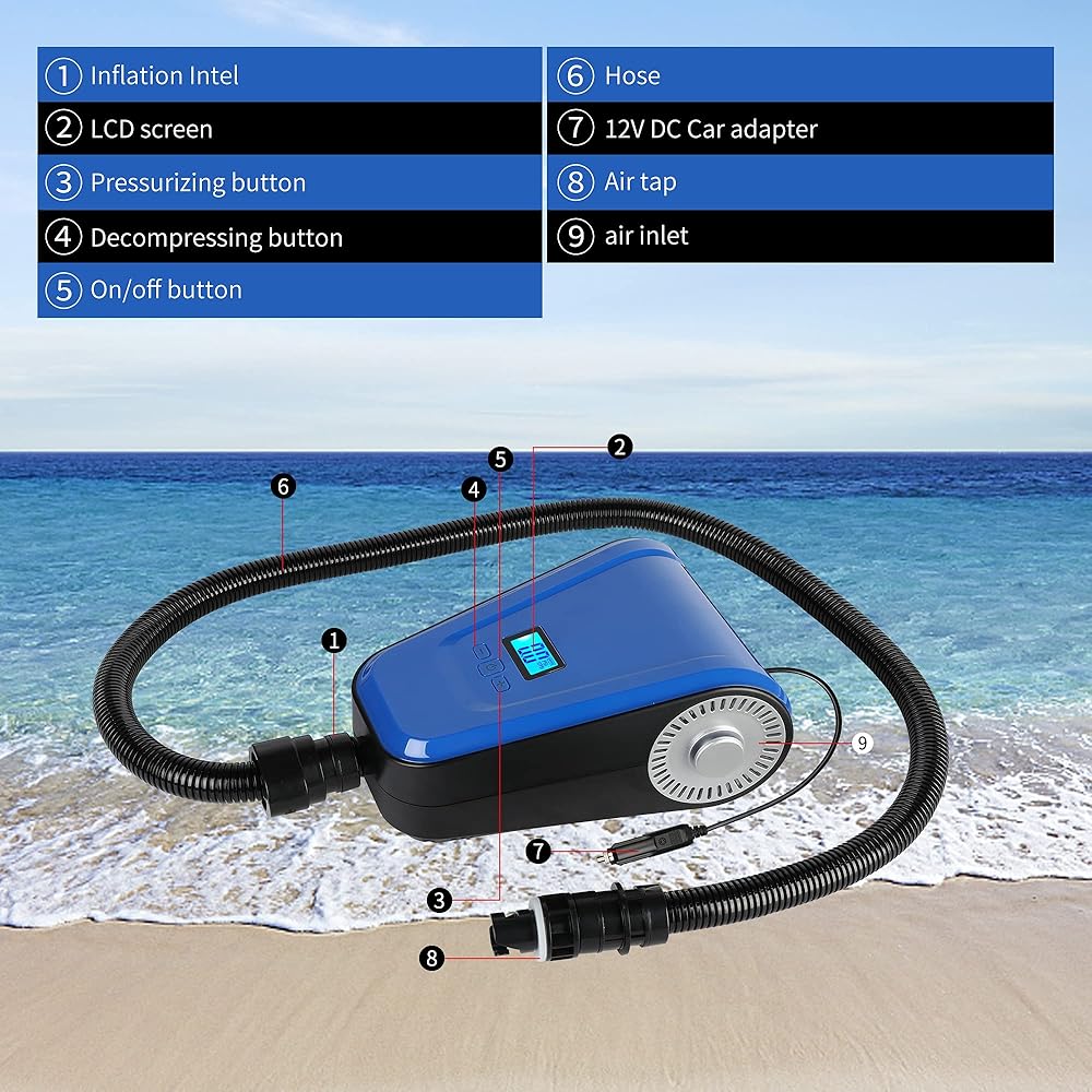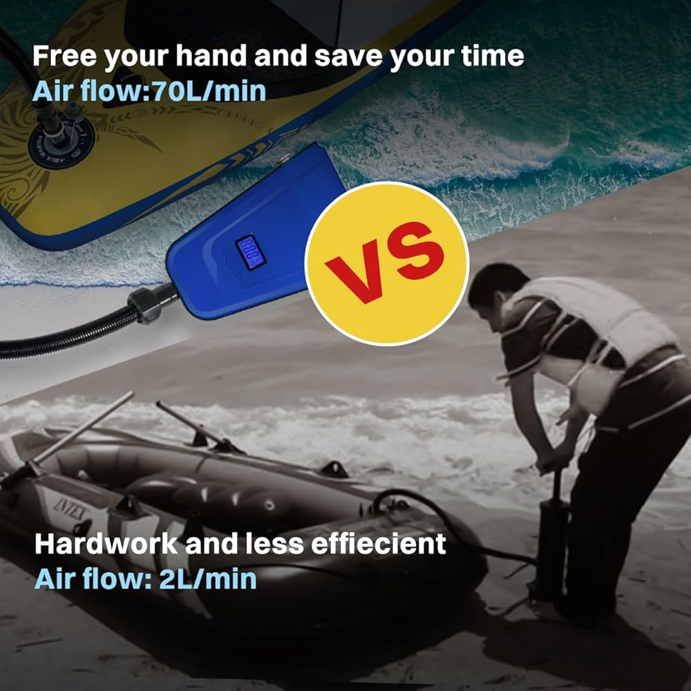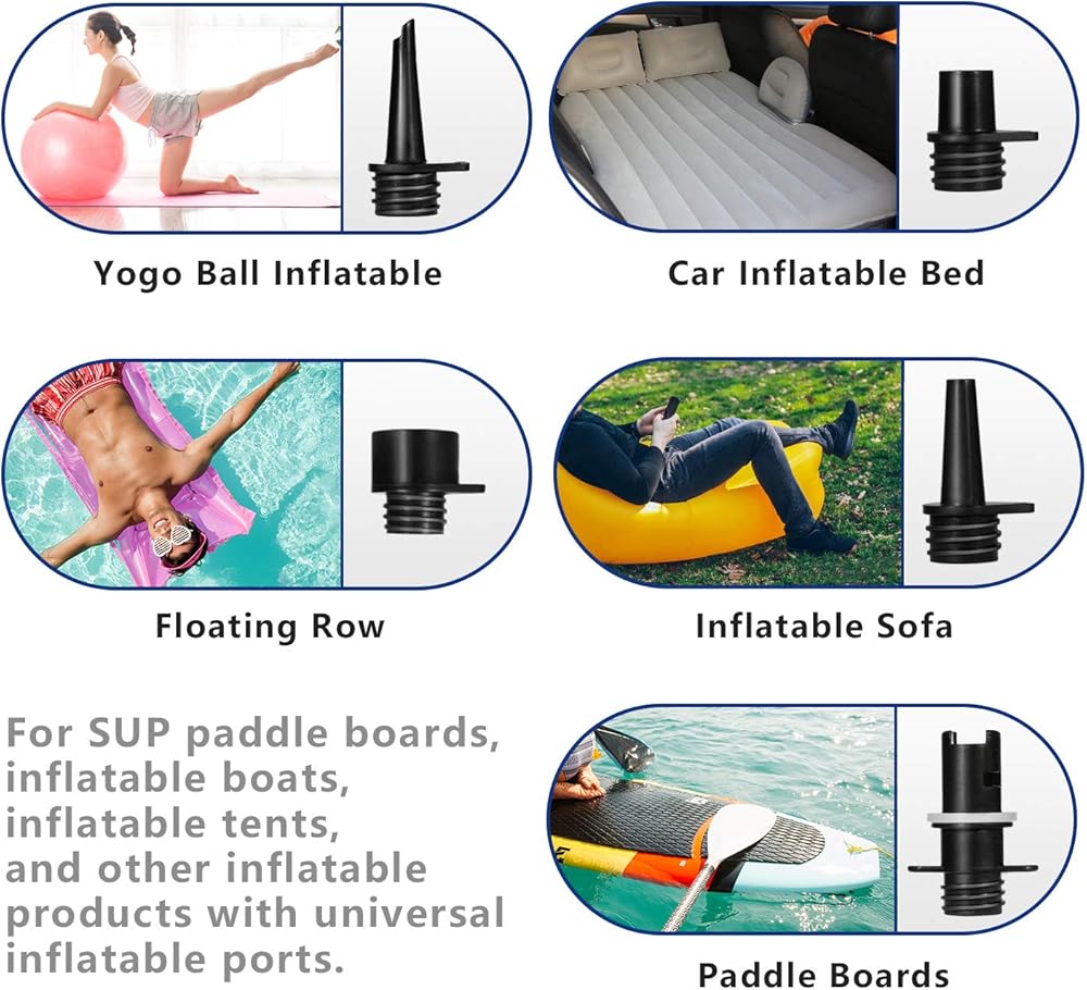 مضخة تضخم 20 رطل لكل بوصة مربعة متعددة الاستخدامات: يصل ضغط مضخة SUP (لوح التجديف القائم) إلى 20 رطل لكل بوصة مربعة. يمكن لمضخة SUP نفخ العديد من المواد القابلة للنفخ مثل لوح التجديف القائم، وكرة اليوجا، والقوارب/قوارب الكاياك القابلة للنفخ، والمراتب الهوائية، وعوامة حمام السباحة، والأريكة القابلة للنفخ، والخيمة القابلة للنفخ، وما إلى ذلك. ملاحظة: مضخة الهواء غير قادرة على تفريغ الهواء، فقط للنفخ .