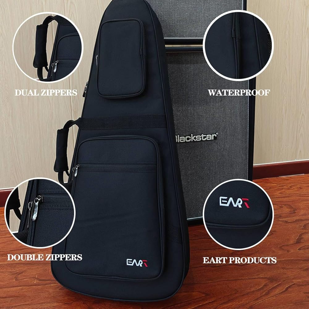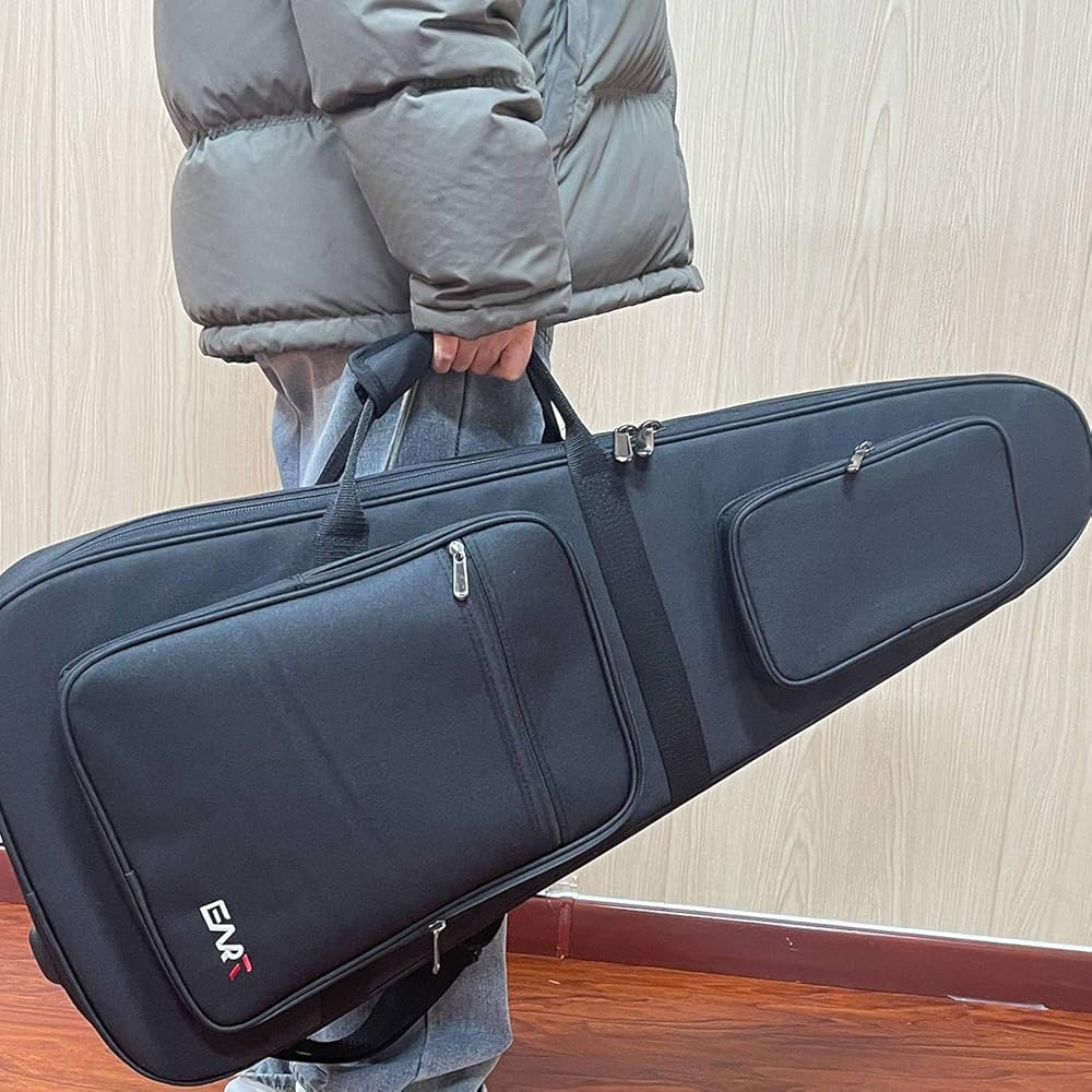 Lightweight Portable Gig Bag for Electric Guitars: Bag dimension 36.22”x16.2”x 6.29”, , fits for 40 inch Headless Electric Guitars. Sturdy and Durable: The guitar bag is made of Oxford waterproof fabric, which has high density and scratch resistance. It has shock-absorbing and compressive sponge inside, PVC elastic plastic bone edging, and reinforced stitching at the joints such as straps and handles, which are comfortable and durable. Back Loop Handle: There is a loop handle on the back of the guitar bag, which can be hung on the wall when not in use. Keep your guitar bag clean and save space. Dual Adjustable Backpack Straps : Provide multiple ways of carrying. Carry as a backpack using the shoulder straps to reduce the stress of the guitar, or take it directly in your hand with the side handle. Durable Metal Zippers: Two-way metal zippers slide smoothly and are not prone to sticking or breaking.Large Storage Space,Front pocket can hold music items like books, sheet music, strings, and more.