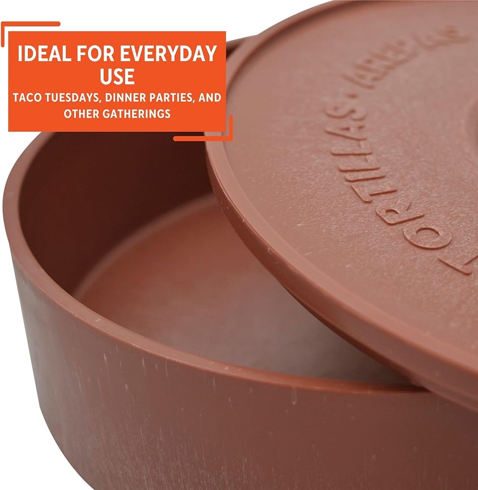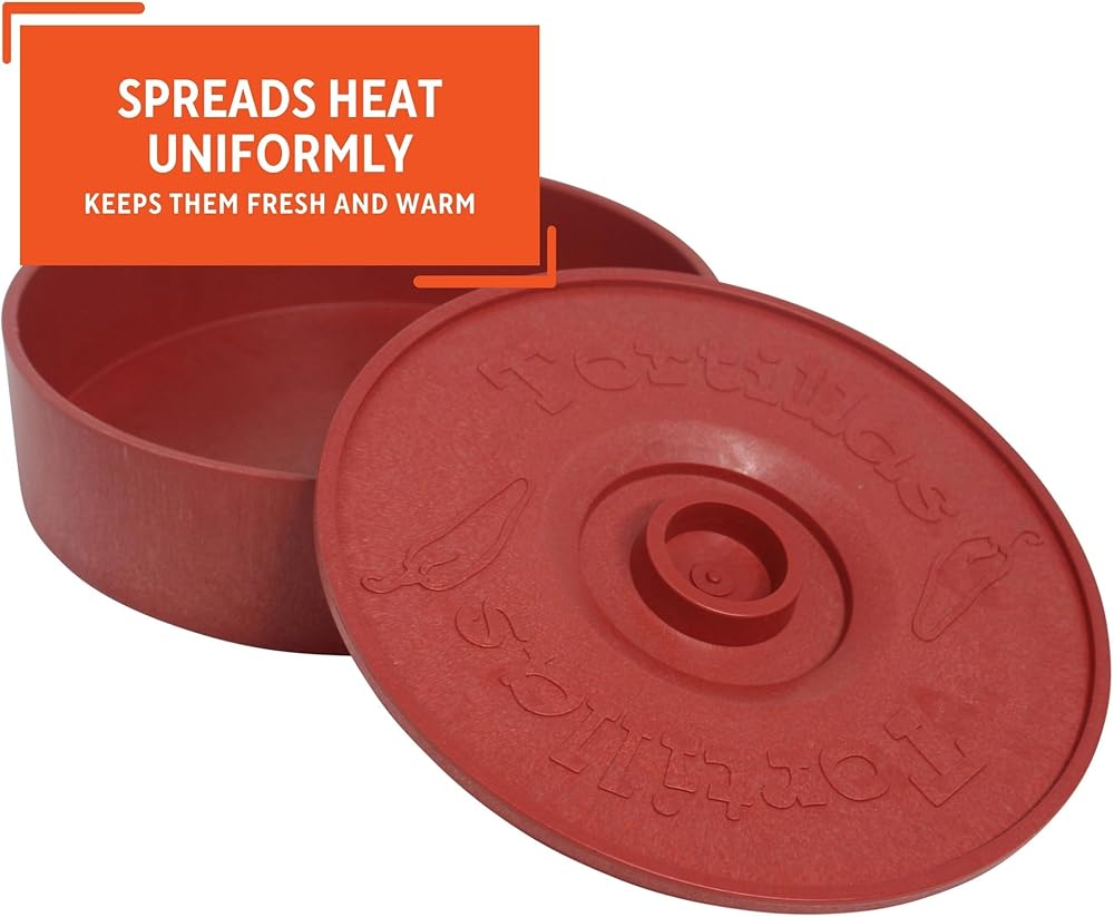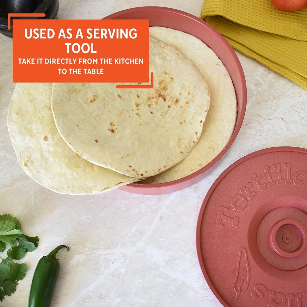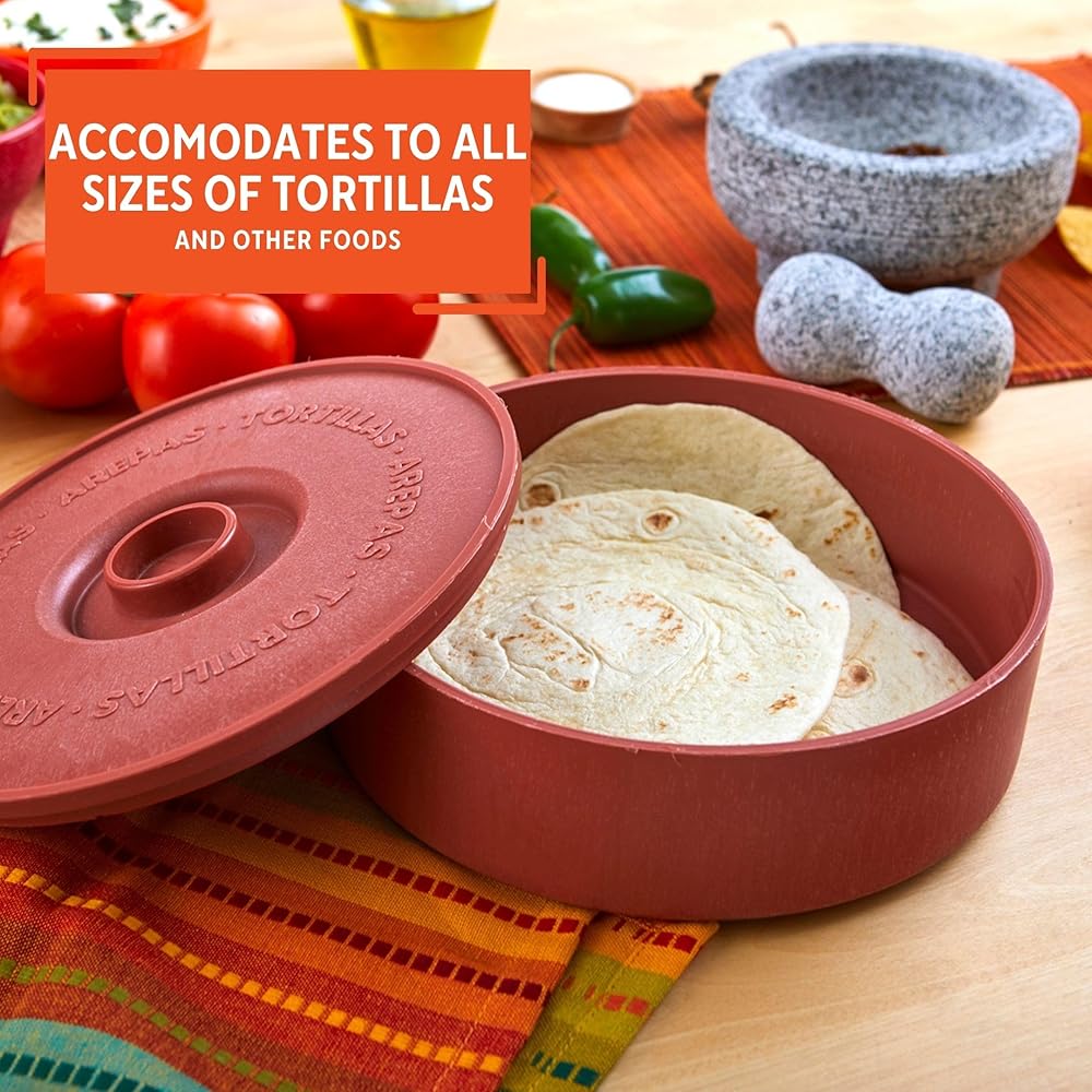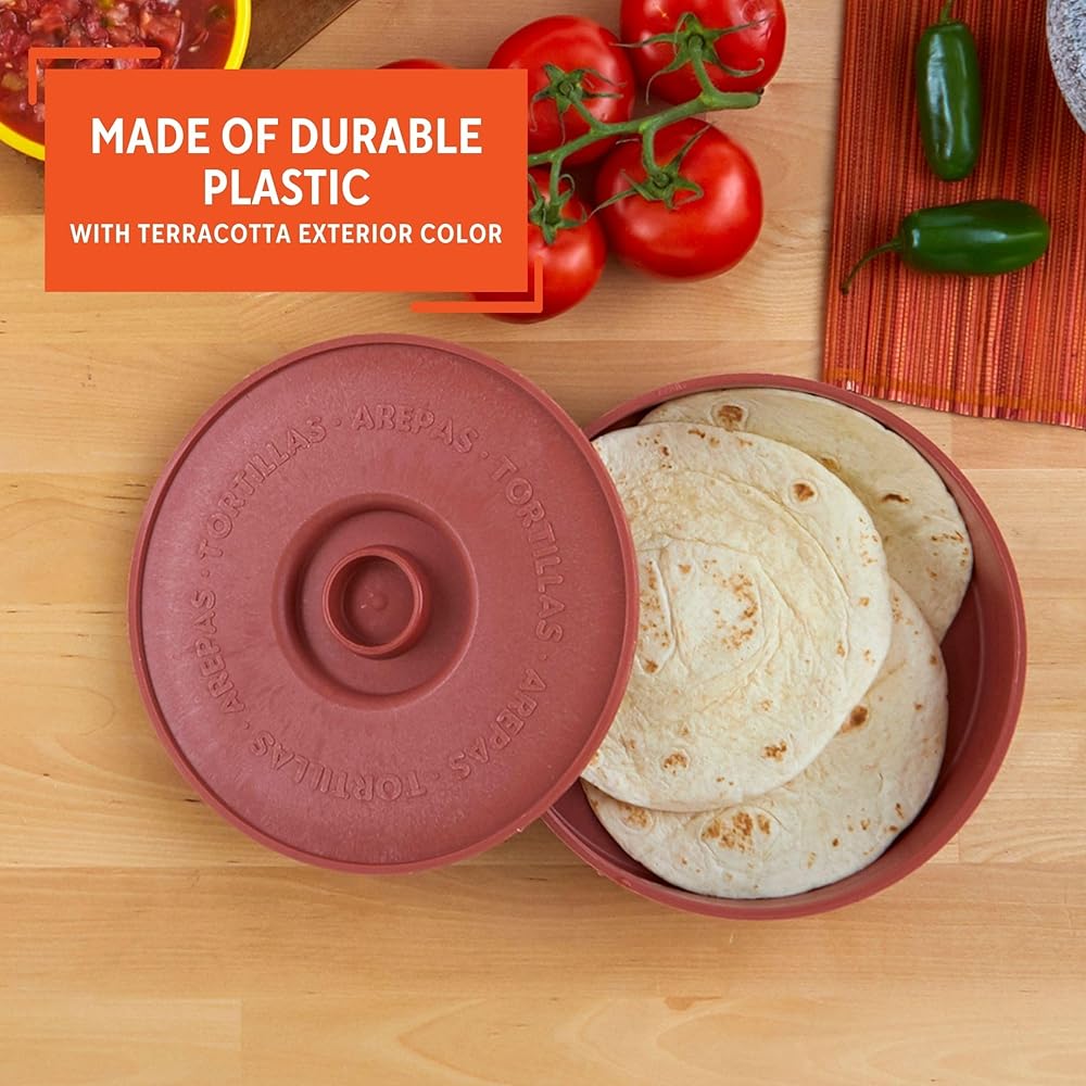 The Imusa 8" tortilla warmer serves as a traditional and decorative presentation piece for your next Mexican-Themed meal. Tortilla warmers are essential in the Mexican kitchen, used to keep tortillas hot, soft, & fresh for up to 1 hour. Tortillas have been used for many centuries, particularly in Mexico and more recently in the United States. The tortilla is consumed all year round, and are most commonly prepared with meat to make dishes such as tacos, burritos, and enchiladas. The Imusa terracotta tortilla warmer is the perfect serving dish for your next fiesta!
