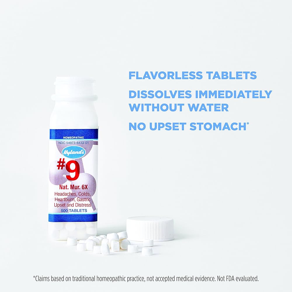 Hyland's no. 9 natrum mur. 6x. Description: headache. Water retention in women. Found in every liquid and solid part of the body. Disclaimer these statements have not been evaluated by the FDA. These products are not intended to diagnose, treat, cure, or prevent any disease.