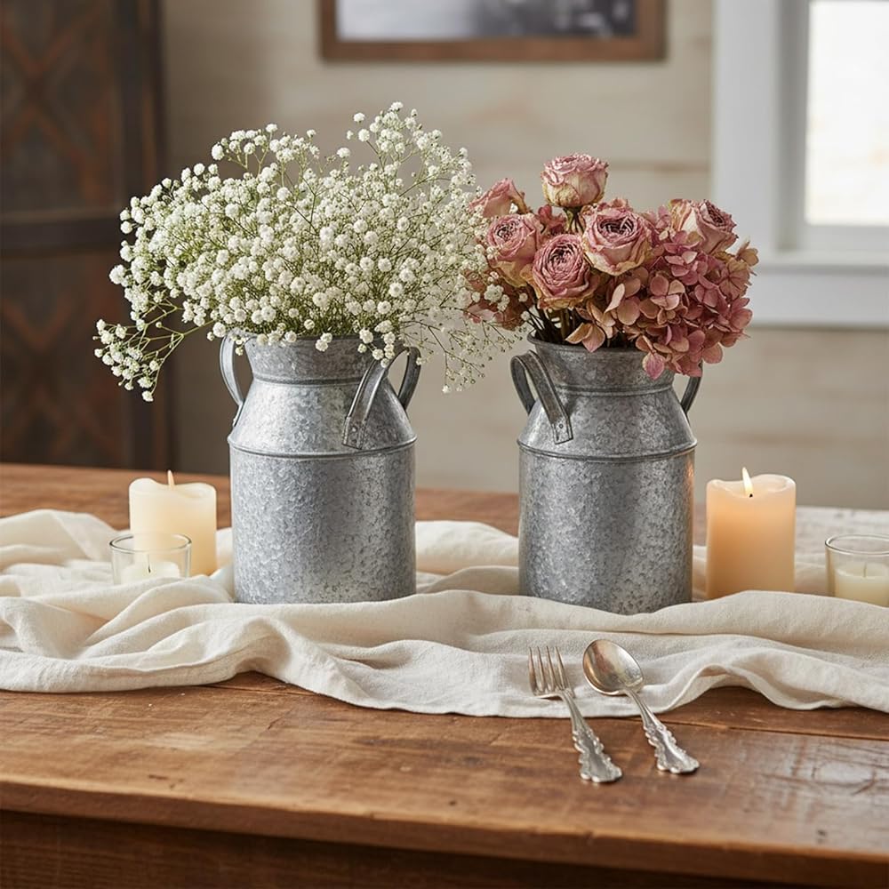 المادة المجلفنة: دلاء الحليب الصغيرة الخاصة بنا مصنوعة من حديد معدني مجلفن عالي الجودة يشبه علبة الحليب العتيقة، ثابتة ومتينة لتدوم طويلاً.