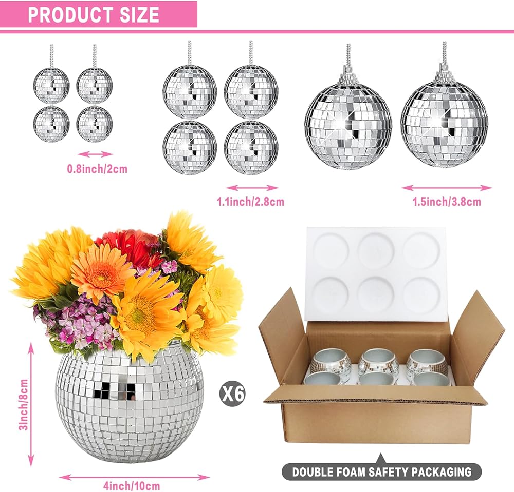 ✨عبوة قيمة: تتضمن المجموعة 6 قطع من مزهريات كرة ديسكو ذات مرآة مقاس 4*3 بوصة و10 قطع إضافية من كرات ديسكو صغيرة ولطيفة (كرتان مقاس 1.5 بوصة، 4 قطع كرات مقاس 1.1 بوصة، 4 قطع كرات مقاس 0.8 بوصة). مثالية لحفلات الزفاف والمناسبات وتعزيز ديكور منزلك.
