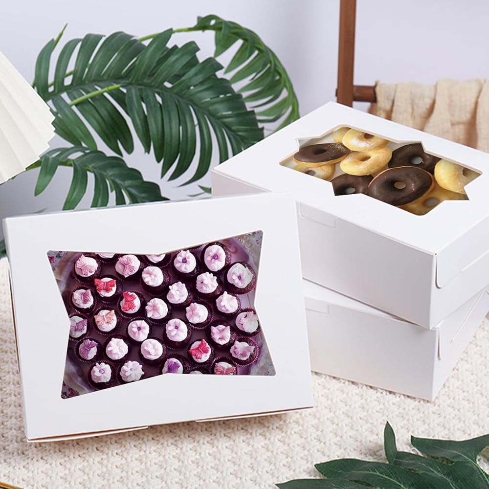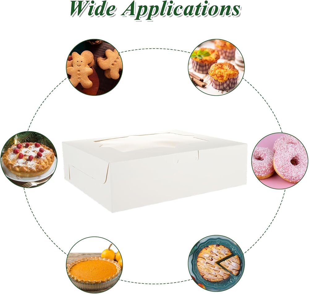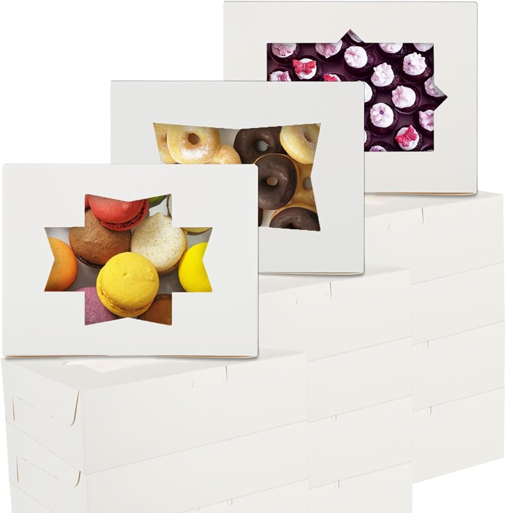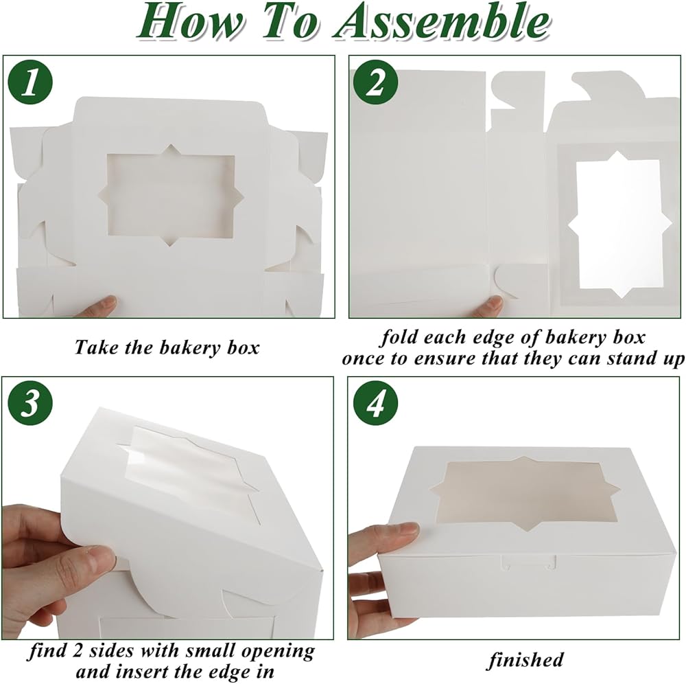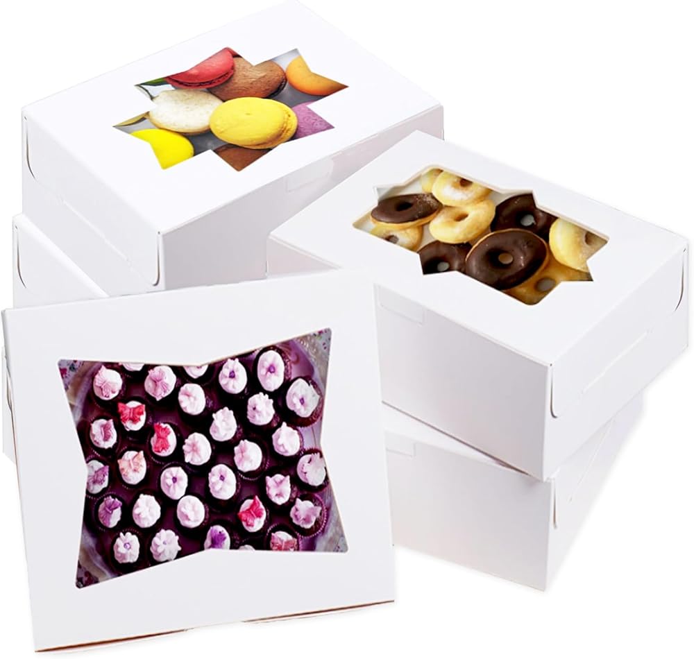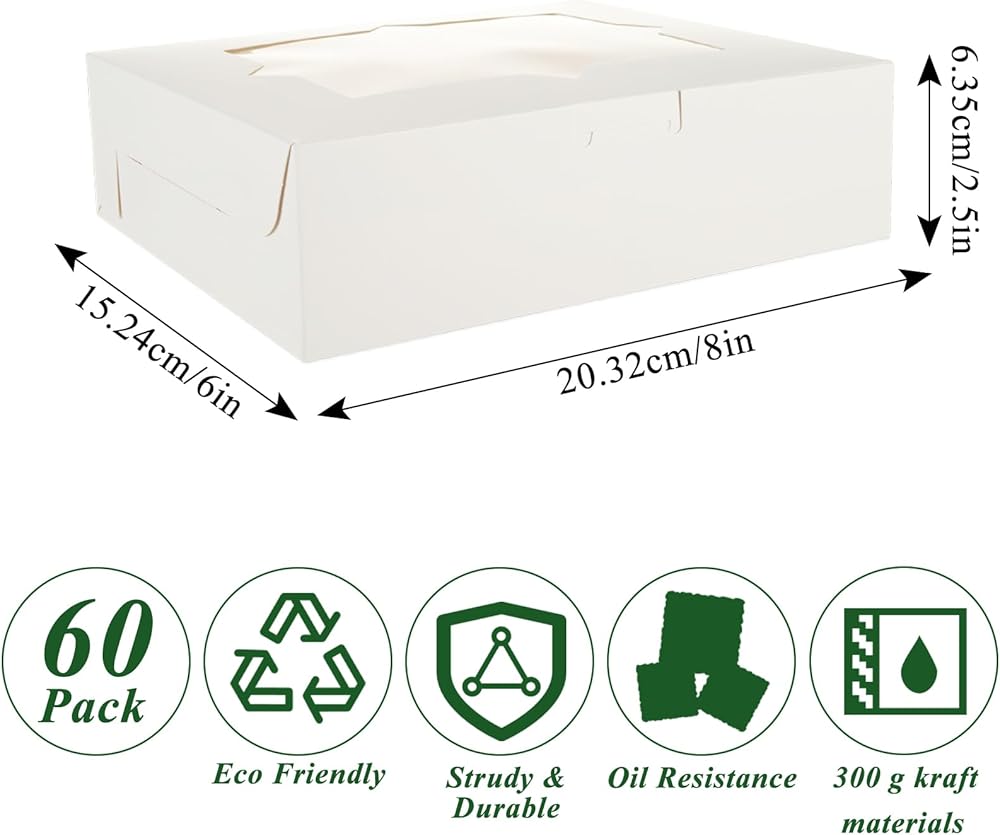 • 8x6x2.5 Bakery Boxes: Our cookie boxes with window is 8x6x2.5 Inch(20.32x15.24x6.35 CM), our bakery boxes can be folded flat for easy storage and can be recycled after each use for next use.