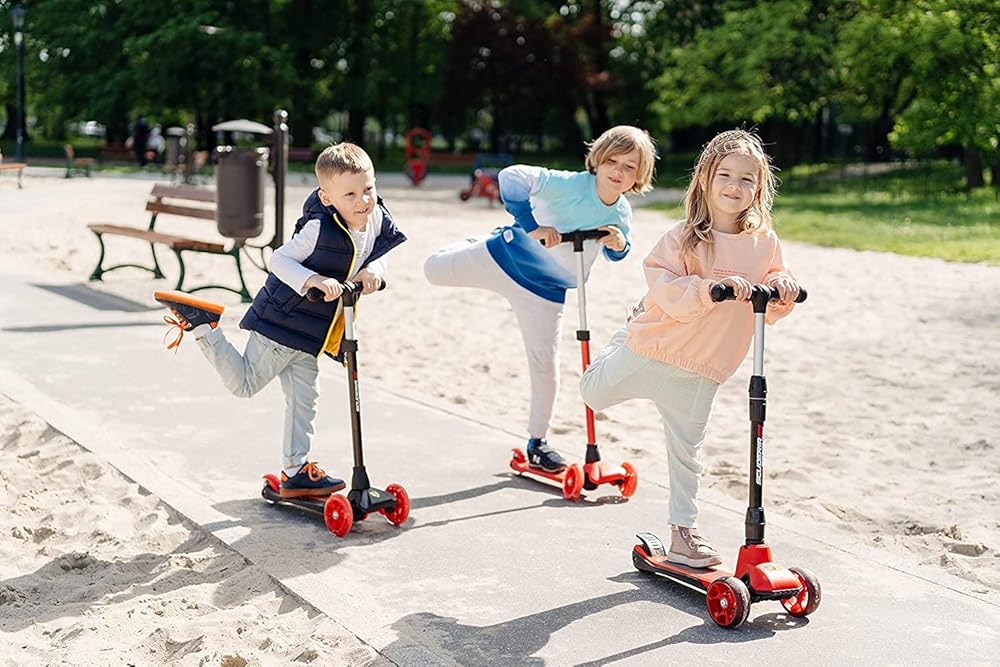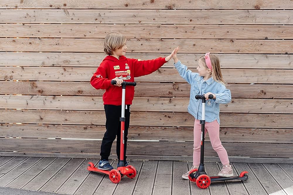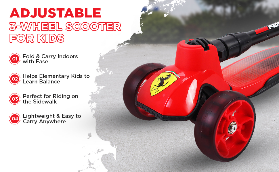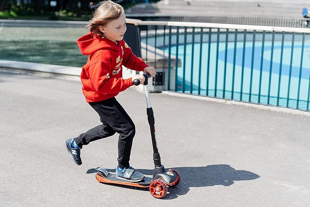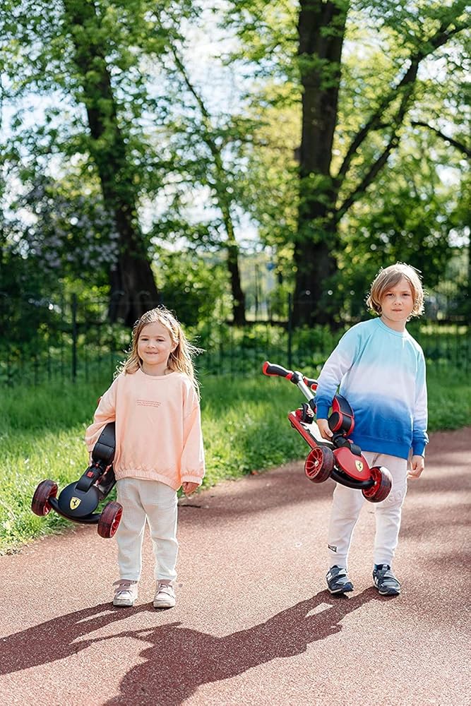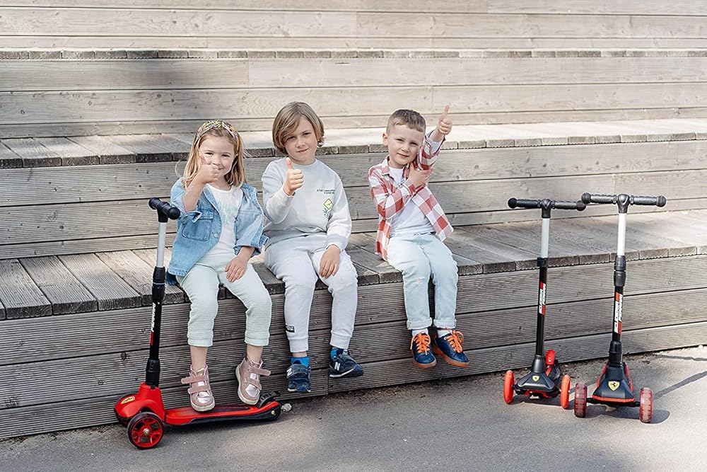 يوفر سكوتر فيراري الفاخر ذو الثلاث عجلات رحلة ثابتة تدعم الأطفال أثناء انحناءهم ونحتهم على الرصيف.