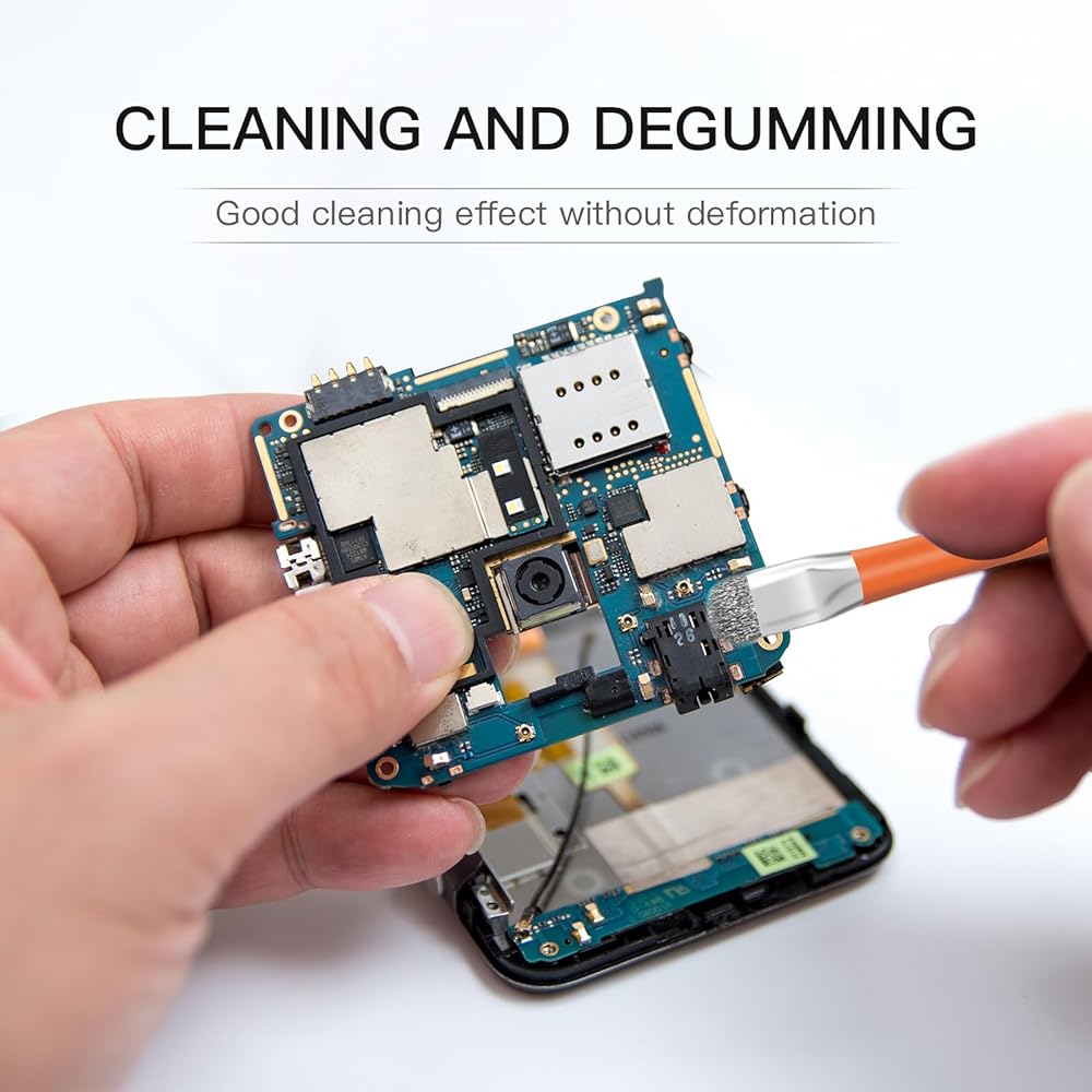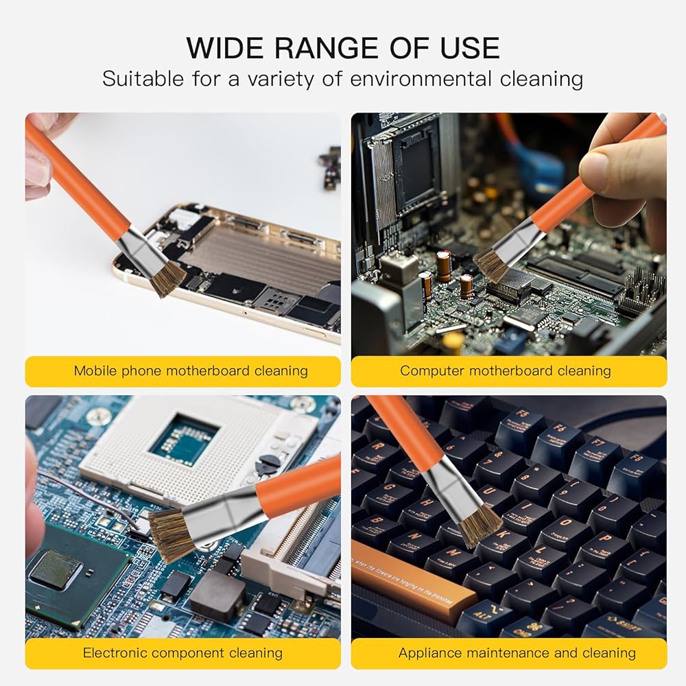 🔰【Product Material】 Electronical Cleaning Brush,ROHS Compliant, Rubber brush holder ensure comfort grip comfort grip,no hot feeling ,help work effectively, Double-Ended Cleaning Brush The two ends are made of(Hog Bristle+Wire Material)Anti-Static No deformation, good toughness, no hair loss .