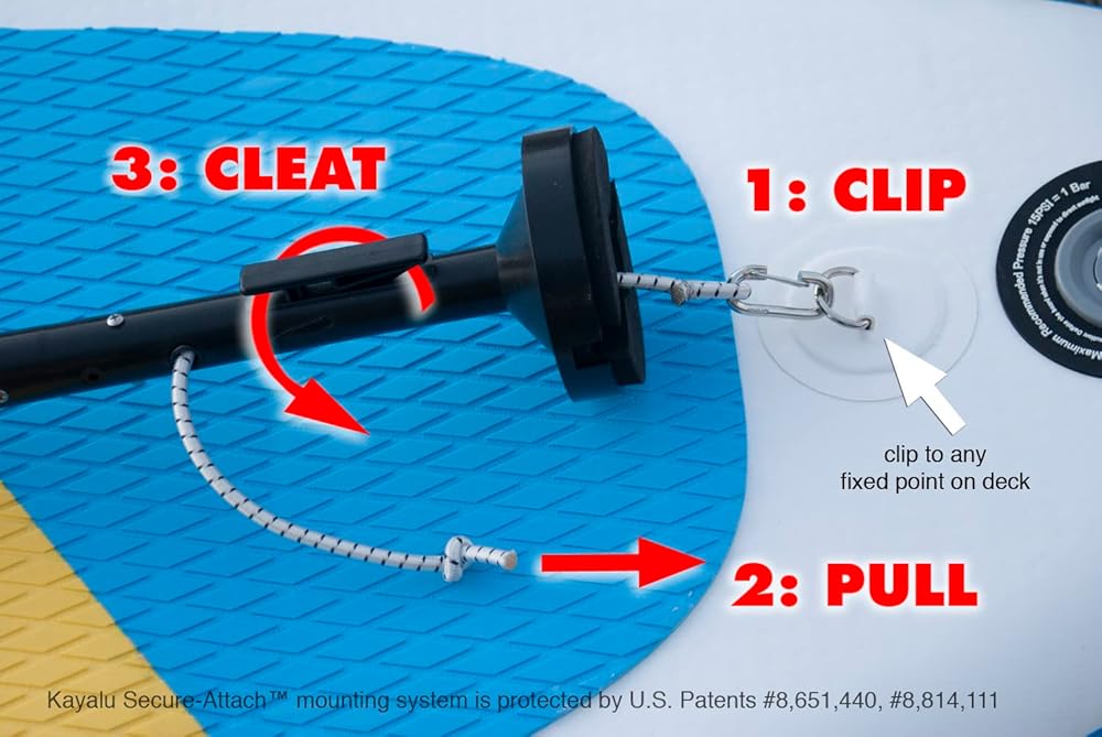 The Kayalite quickly clips onto any existing eyelet or pad eye on your deck. To secure, you simply pull the tension cord taut with a single hand and cinch it on the Kayalite′s built-in jam cleat. In a pinch, the Kayalite can be clipped to your kayak's deck rigging or carry handle, canoe bench or dinghy transom &mdash even hoisted up a mast.