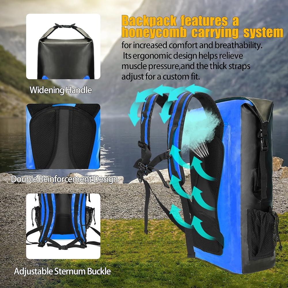 Versatile Carrying Options & Safety: The waterproof dry bag backpack can be conveniently carried by the handle or worn as a backpack using the included shoulder straps. Whether you're hiking, camping, climbing, biking, or engaging in water sports like floating, kayaking, swimming, rafting, boating, or canoeing, the dry bag ensures a hassle-free adventure.