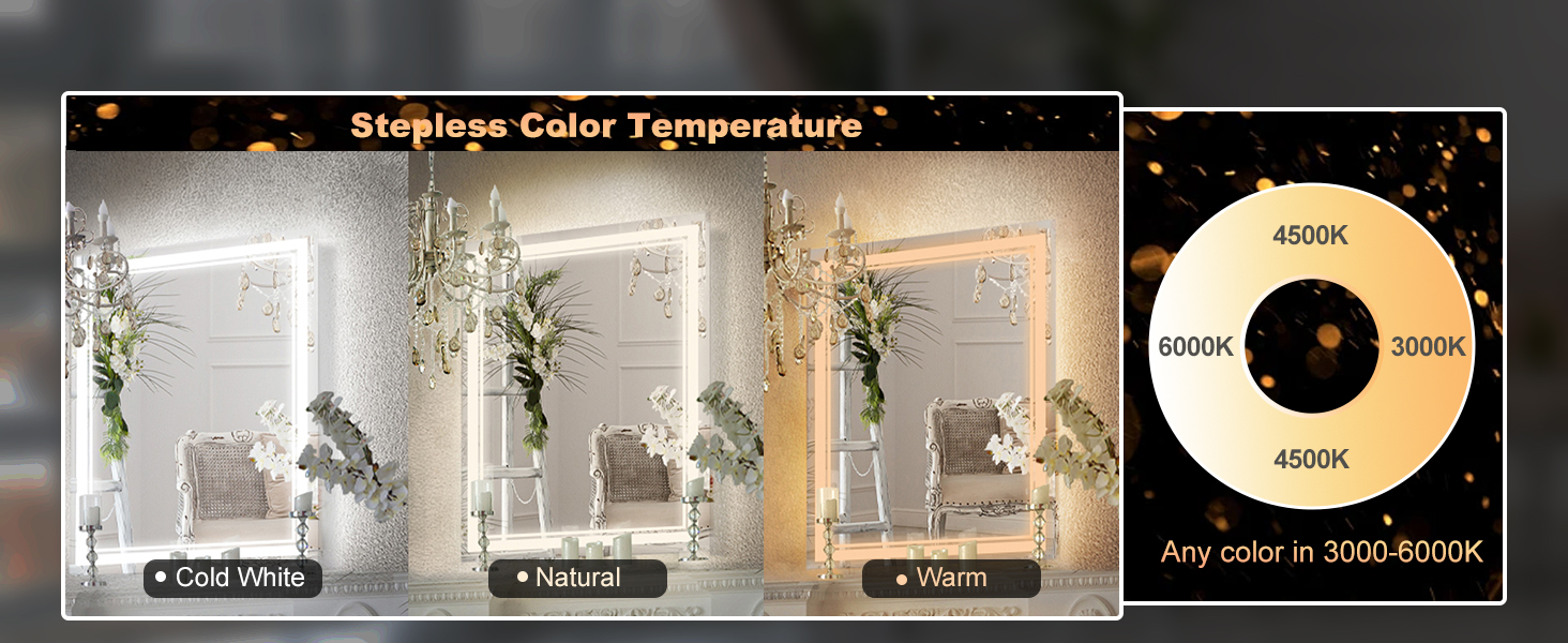 【لون بدون خطوات وقابل للتعتيم】تحتوي مرآة الحمام LED على 3 أوضاع إضاءة: ضوء بارد (6000 كلفن)، ضوء محايد (4500 كلفن) وضوء دافئ (3000 كلفن)، والتي يمكن أن تلبي احتياجات الإضاءة المختلفة عند وضع المكياج أو الحلاقة. يمكنك أيضًا ضبط السطوع وفقًا لمستوى راحتك. وظيفة الذاكرة الذكية تسجل آخر إعدادات الإضاءة، والمرآة الذكية، والمنزل الذكي