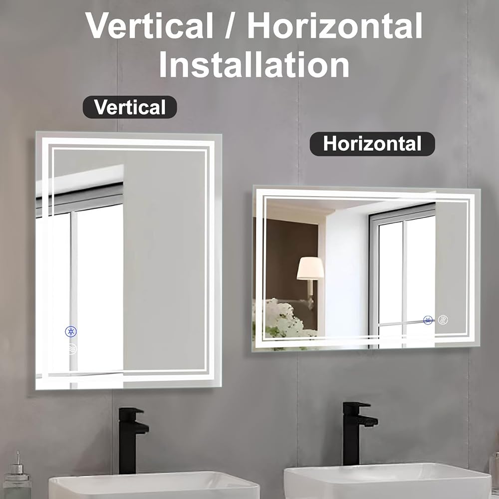 مرآة حمام LED من SaniteModar، مرآة حمام مقاس 36 × 28 بوصة مع أضواء، قابلة للتعتيم 3 ألوان أكثر سطوعًا، مرآة زينة مثبتة على الحائط مضادة للضباب مع لمسة أفقية/عمودية...