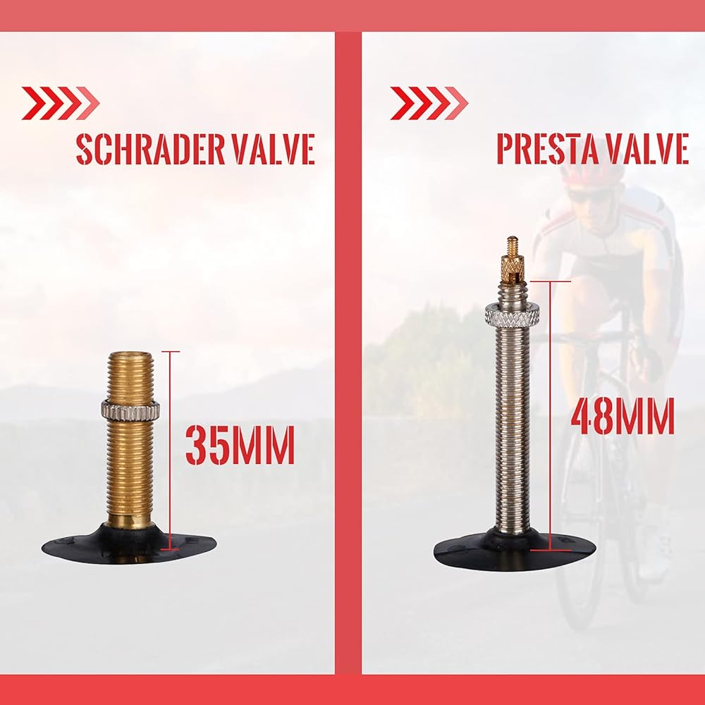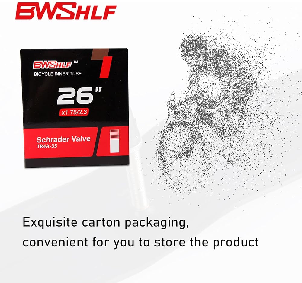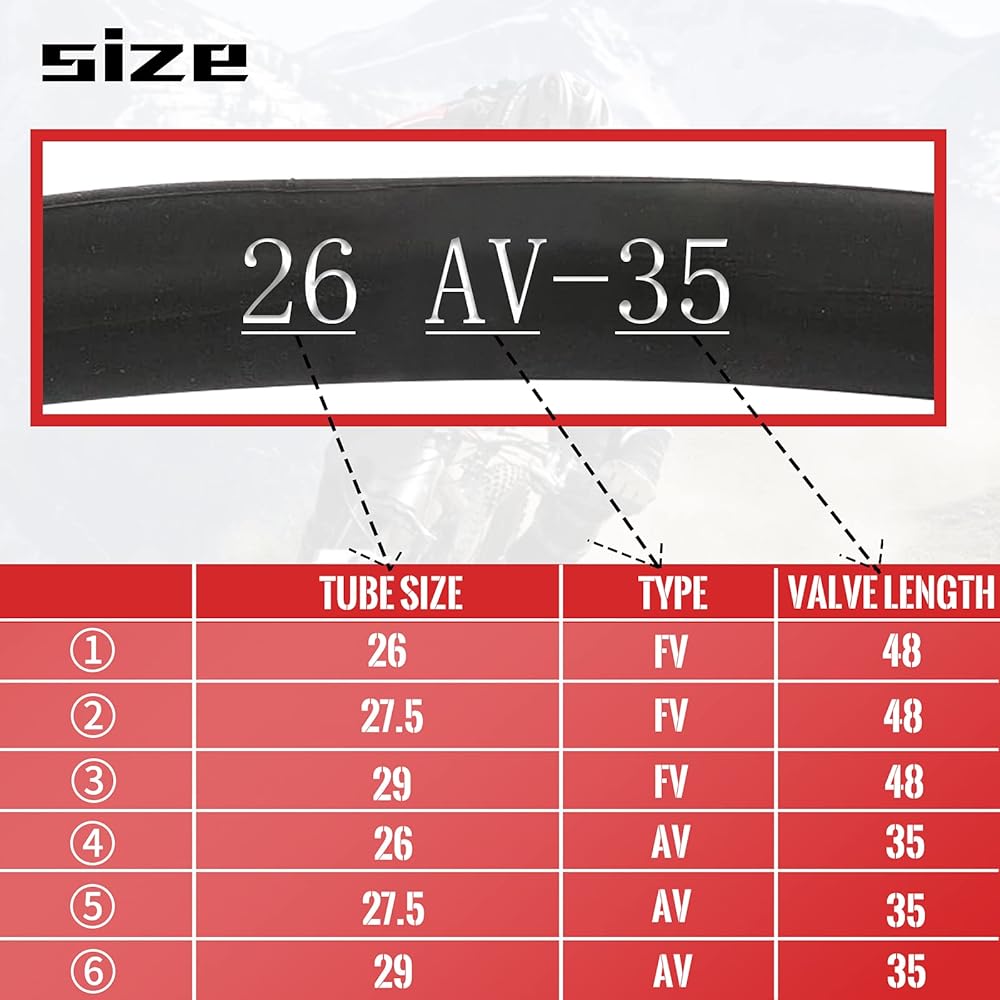مقاسات مختلفة: 26x1.75-2.3؛ صمام شاردر A/V مقاس 35 مم؛ 26 يعني أن أنابيب الدراجة الخاصة بنا تناسب 26 عجلة (يُرجى التأكد من أن إطار دراجتك مناسب قبل الشراء)، بعرض يتراوح بين 1.75-2.3 إطار. صمام شريدر قياسي 35 مم مناسب لمعظم أنابيب MTB الداخلية