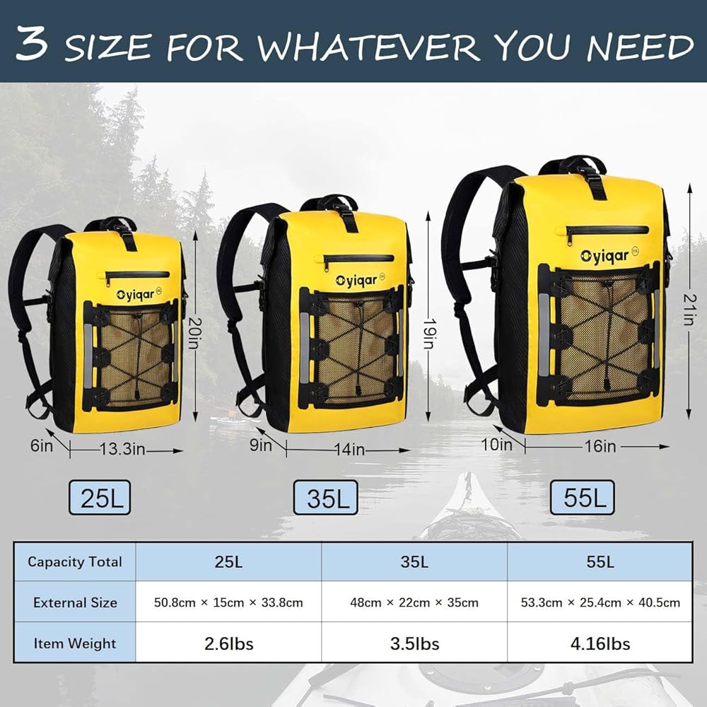 مساحة تخزين واسعة وآمنة: 3 مقاسات للاختيار: 25 لتر (5.5 جالون)، 35 لتر (9 جالون)، 55 لتر (14.5 جالون) الجيب الأمامي لحقيبة الظهر الجافة يسمح بتخزين الضروريات الصغيرة وعدم الحاجة إلى الحفر في القسم الرئيسي. احذر من أن هذا الجيب ليس مقاومًا للماء تمامًا ولكنه مقاوم لرذاذ الماء، فلا تضع أشياء ثمينة مثل هاتفك. في الداخل، تساعد الجيوب الداخلية الثلاثة على تخزين تلك المتعلقات عالية القيمة أو أي شيء تريد حماية إضافية له. مثل الكمبيوتر المحمول، والهواتف، والمفاتيح، كما توفر خيارات تخزين منظمة.