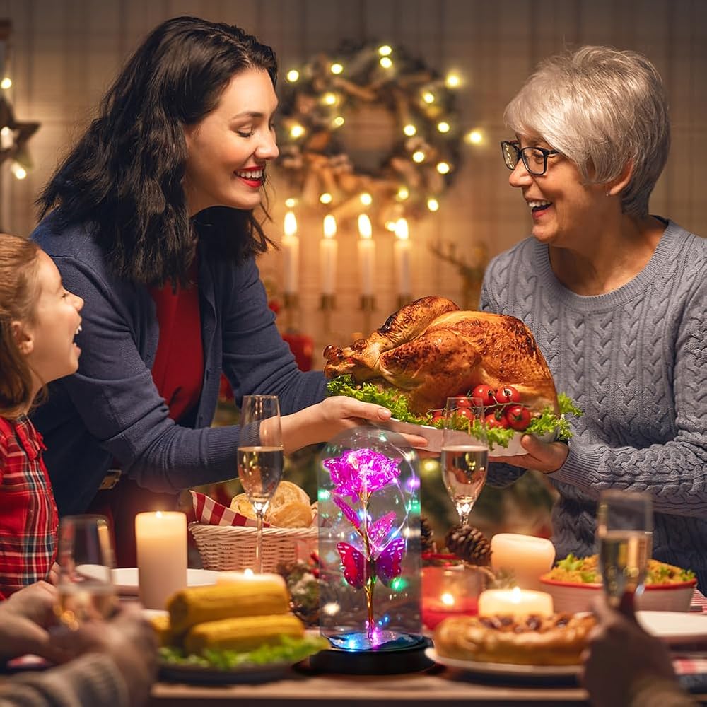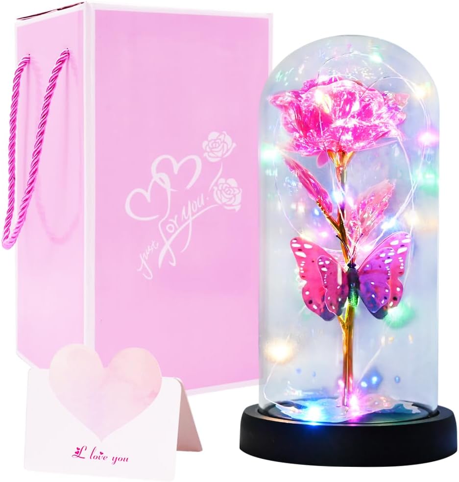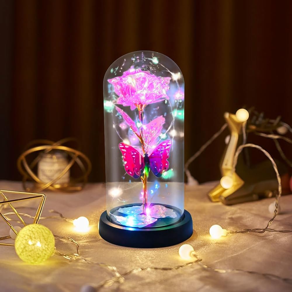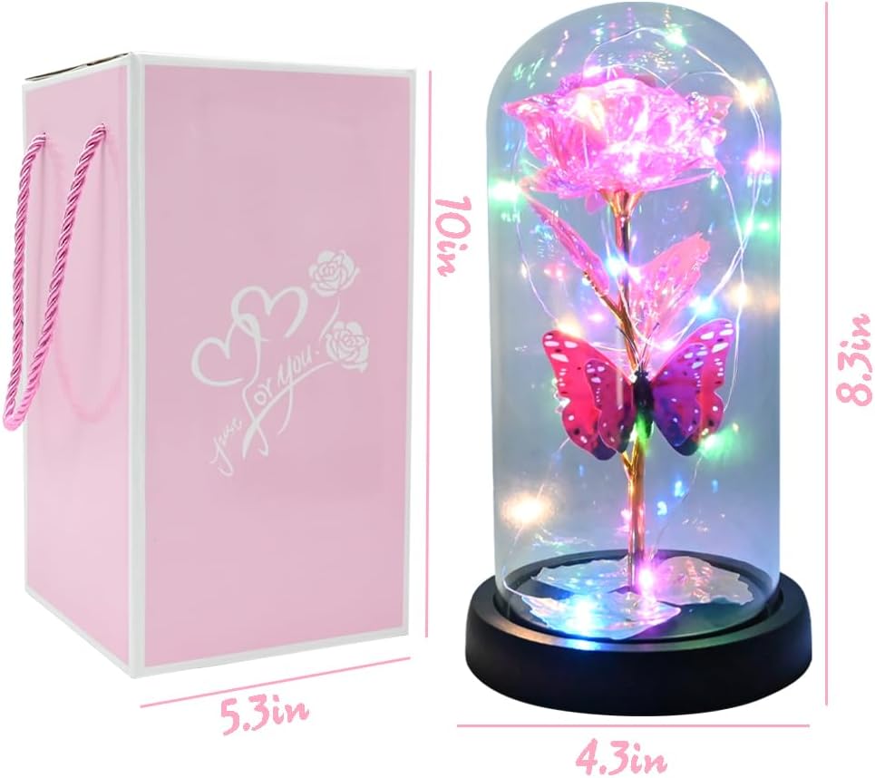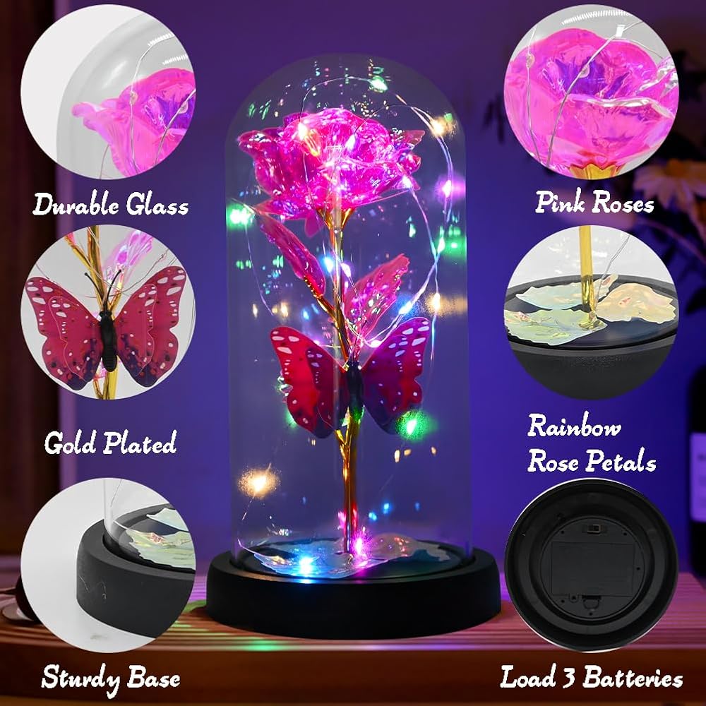 🌹 Mothers Day Gifts for Mom: The rose is plated with a large pink butterfly and a shiny crystal flower on a black plastic base. Colorful butterflies dotted it, making the galaxy rose full of magic. And the glass rose is wrapped around an LED Strip tree lamp, Powered by 3 AAA batteries(not included).