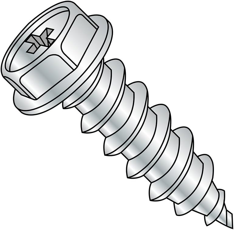 The zinc plated steel sheet metal screw with hex washer head and Phillips drive has a Type AB point for forming threads in thin metals between 0.015" and 0.050" thick and resin impregnated plywood. The Type AB point has the conical tip of a Type A point with the finer spaced threads of a Type B point. Steel is often used in applications where strength is the primary consideration. The zinc plating offers corrosion resistance and has a reflective appearance. The hex washer head has six flat sides that a wrench can grip to turn from the side, enabling use when there is no space above the head for a screwdriver. The flange acts like a washer to increase the fastener's bearing surface and distribute the clamping force over a larger area, reducing damage to the material being fastened. The Phillips drive has an x-shaped slot that accepts a Phillips driver and is designed to allow the driver to slip out of the head to help prevent over-tightening and damage to the thread or fastener.