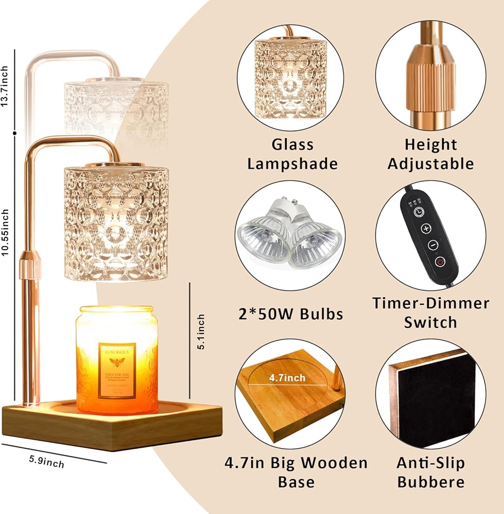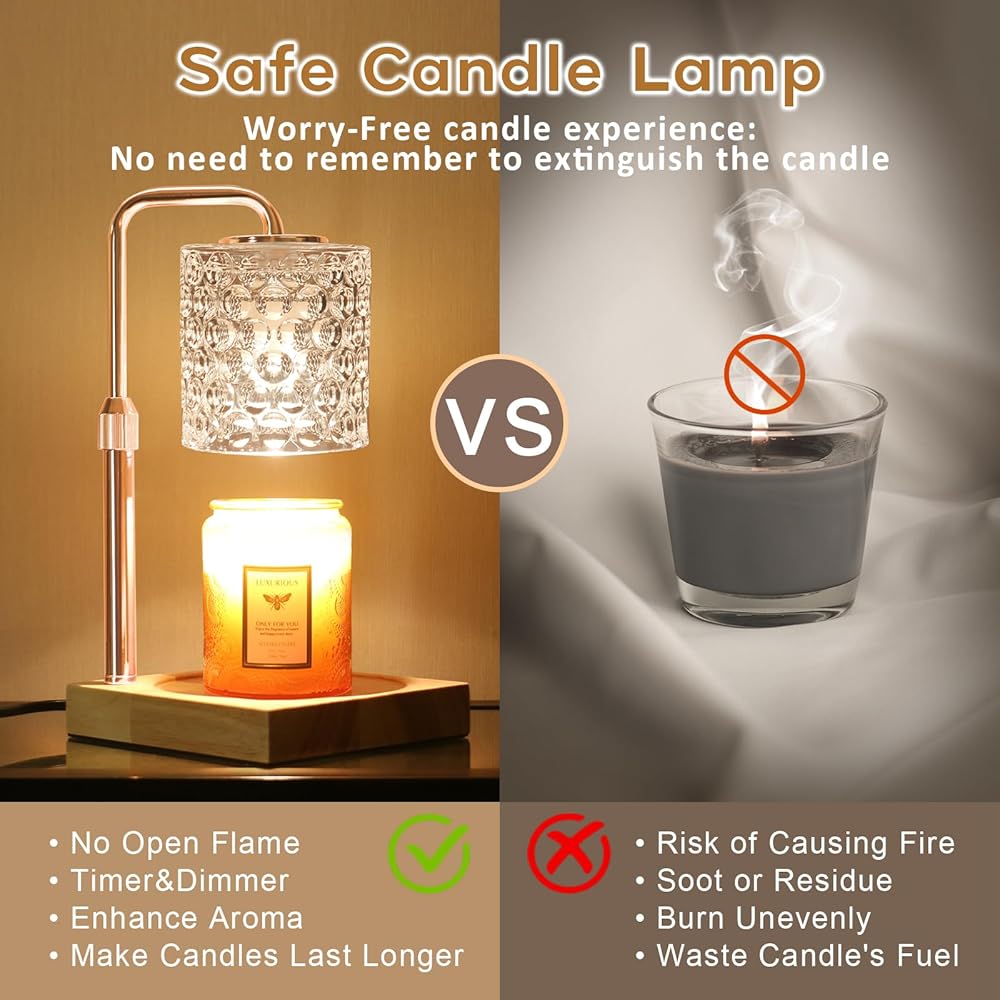 [يناسب جميع أحجام الشموع]: يمكن تعديل المسافة بين عاكس الضوء وقاعدة مصباح تدفئة الشموع هذا، بما يتوافق مع شموع يانكي ومعظم أنواع الشموع أو الشمع المختلفة. تحت القاعدة الخشبية، يتم إضافة وسادات مضادة للانزلاق لضمان الثبات، مما يجعلك تشعر بالأمان عند استخدام مصباح تدفئة الشموع هذا لشموع البرطمان. قل وداعًا لهيب الشموع وحافظ على منزلك آمنًا من مخاطر الحريق مع لمبة الهالوجين.