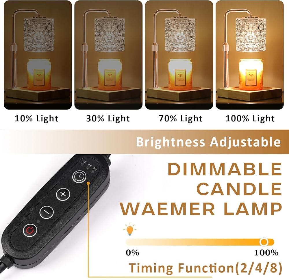 [التحكم في المؤقت والتعتيم]: مصباح تسخين الشموع هذا مع ميزة المؤقت يسمح بإضاءة قابلة للتعديل وله وظيفة إيقاف لمدة 2/4/8 ساعات. سهل الاستخدام، سوف يذوب شمع الشمع بالتساوي خلال دقائق. مع أربعة إعدادات للتعتيم (درجة الحرارة)، فإنه يلبي احتياجات الأجواء المختلفة. كلما زاد إعداد السطوع، زادت سرعة ذوبان الشمعة.
