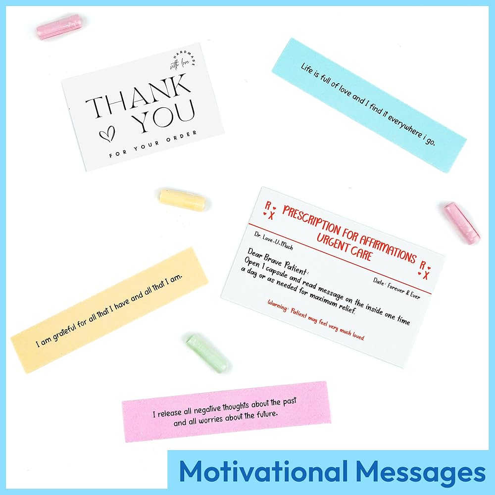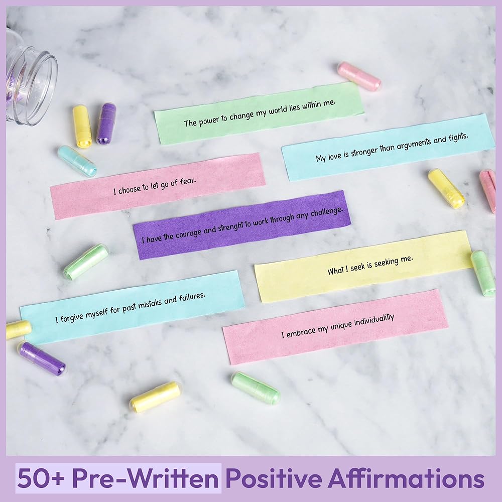 • 50+ PRE-WRITTEN AFFIRMATION MESSAGES in a bottle - Unlike regular ones with empty notes or other affirmation cards, our capsules contain positive affirmation messages already penned on the paper inside. Skip the hassle of opening and resealing each capsule – we've taken care of that for you.