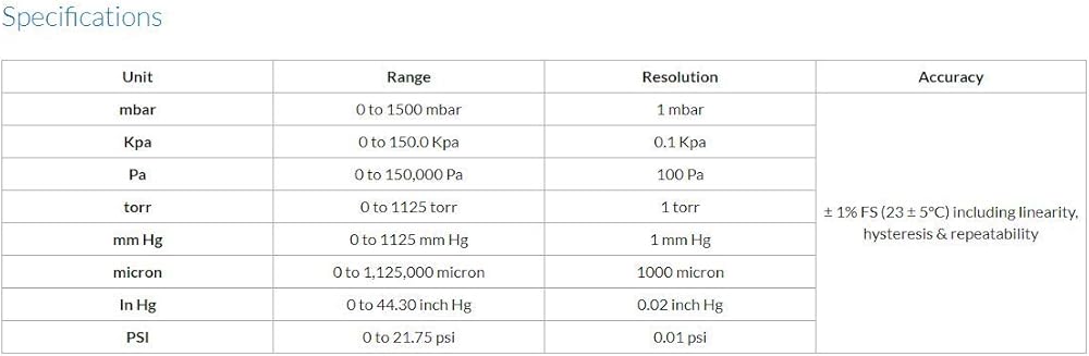 Measures Gas, Liquid and Vacuum Pressure. Portable meter for absolute vacuum pressure measurements in hospital labs, crystal growing, solvent recovery, distillation, and rotary evaporation. Also used in HVAC, automotive and other industrial applications. Includes a detachable heavy-duty probe with ¼ PS connector for liquid, air, oil and gas. Features a large display with eight units of measure, min/max, hold, low battery indicator, auto power off and an RS232 computer interface. Comes ready to use in a foam-lined, hard-shell carrying case, with 9V battery and instructions. N.I.S.T. traceable certificate of compliance available. Dimensions: 7" × 3" × 1½" (180 × 75 × 35 mm), probe cord: 49” (125 cm) Weight: Meter 8 oz. (220 g), Probe 6 oz. (170 g).