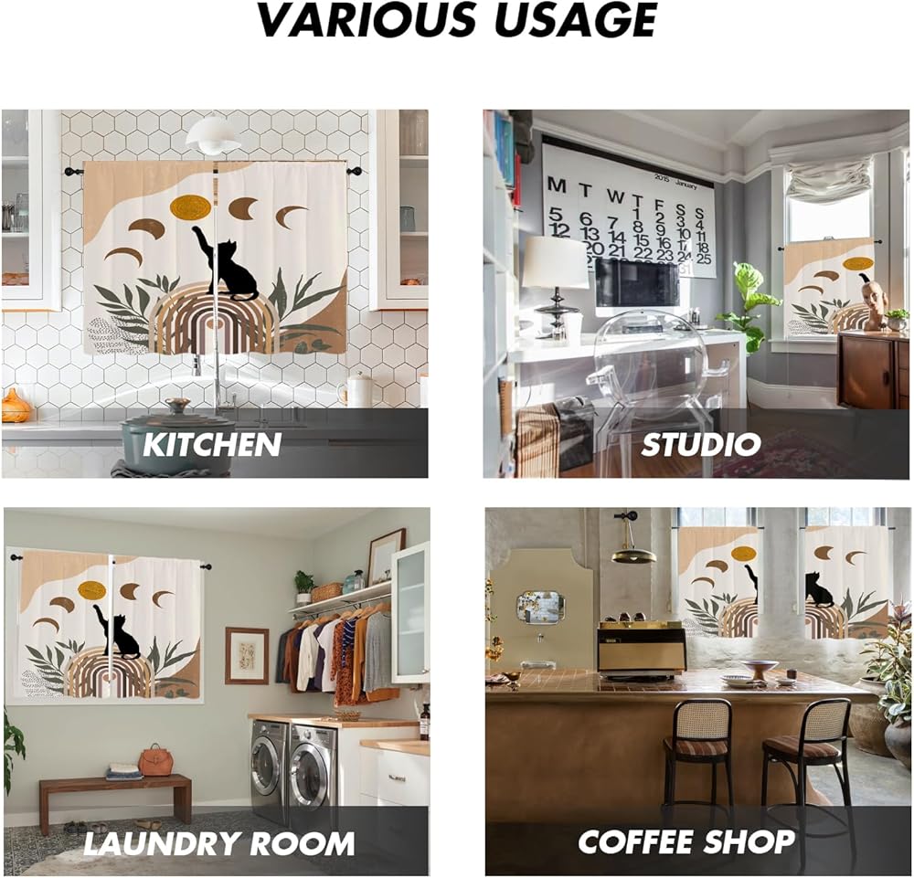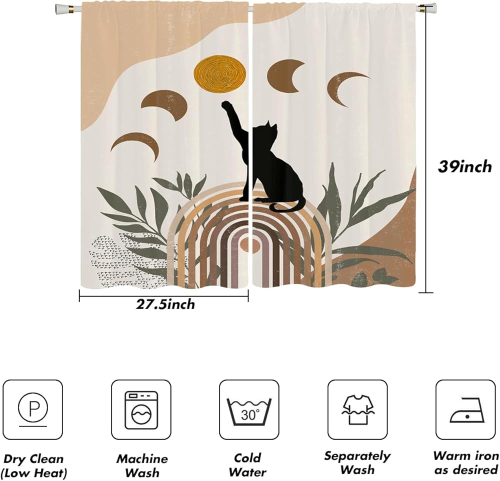 ستائر مطبخ قطة سوداء مضحكة صغيرة مقاس 27.5 بوصة عرض × 39 بوصة طول قمر بوهو مجردة حديثة من الطين الفخاري جمالية هندسية قصيرة صغيرة لغرفة المقهى ستائر نافذة العلاج طبقات النسيج 1 زوج