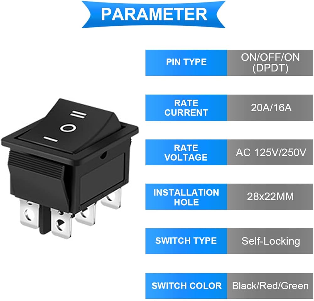 ✅【PARAMETER】Control Rating: AC 16A/250V 20A/125V; Type: ON-OFF (DPST); Switch Color: Black/Red/Green/Yellow/Blue(Note: The black switch has no LED function)