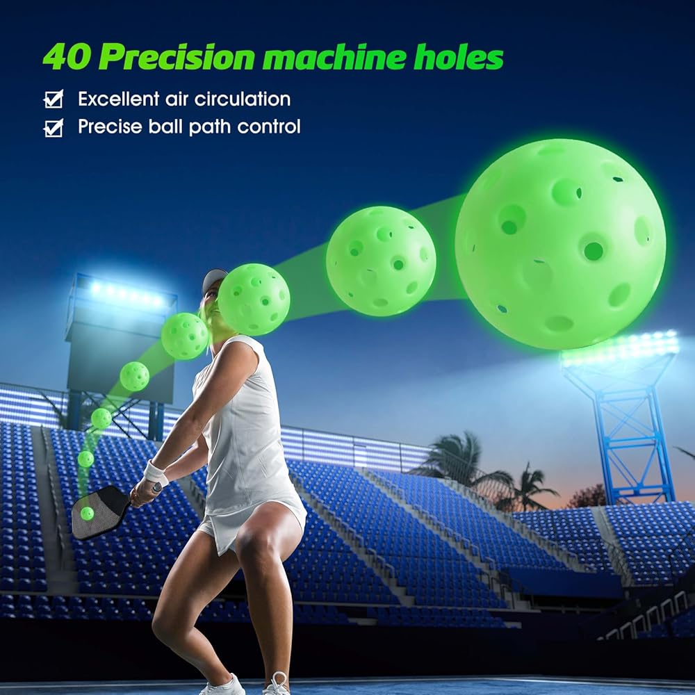 【40 فتحة دقيقة】تم تصميم كرات كرة البيكل المضيئة بـ 40 فتحة آلية دقيقة، والتي توفر دورانًا ممتازًا للهواء وتحكمًا دقيقًا في مسار الكرة، مما يجعل كل لقطة لك مثالية.