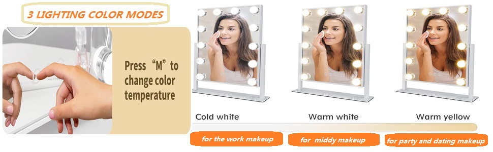 【سطوع قابل للتعديل و3 أوضاع إضاءة ملونة】يمكن تغيير سطوع LED لمرآة الغرور المضيئة في هوليوود حسب الحاجة. توفر مرآة المكياج المزودة بمصباح LED 3 أوضاع إضاءة ملونة، يمكنك ضبط درجة سطوع مختلفة لتلبية احتياجات المكياج المختلفة سواء كان ذلك في الصباح الباكر أو في وقت متأخر من الليل.