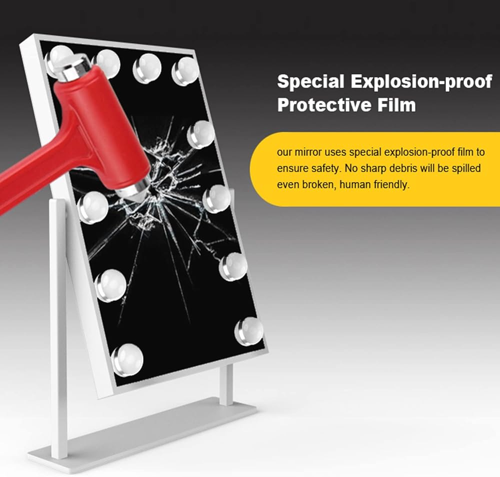 【آمنة ومتينة】يمكن أن تدوم مصابيح LED الـ 12 الموجودة في مرآة الزينة لمدة 50000 ساعة، وهي متينة للغاية، ولا حاجة إلى استبدال المصابيح؛ الجزء السفلي مزود ببطانة غير قابلة للانزلاق لمنع المرآة من الانزلاق أثناء الاستخدام. يعتمد المصباح بأكمله على التغليف الرغوي الشامل للقولبة الآمنة، وهي آمنة ونظيفة ومرتبة.