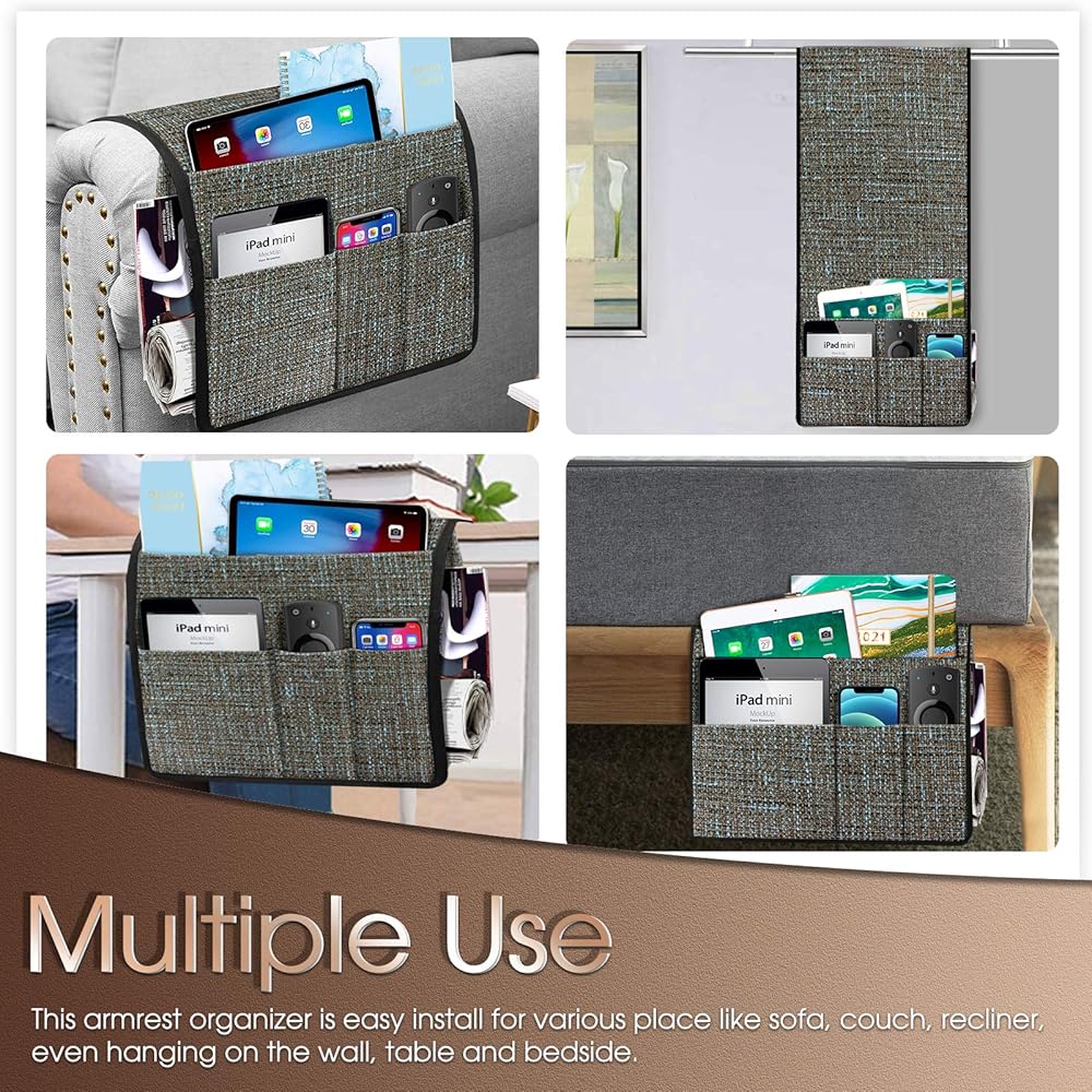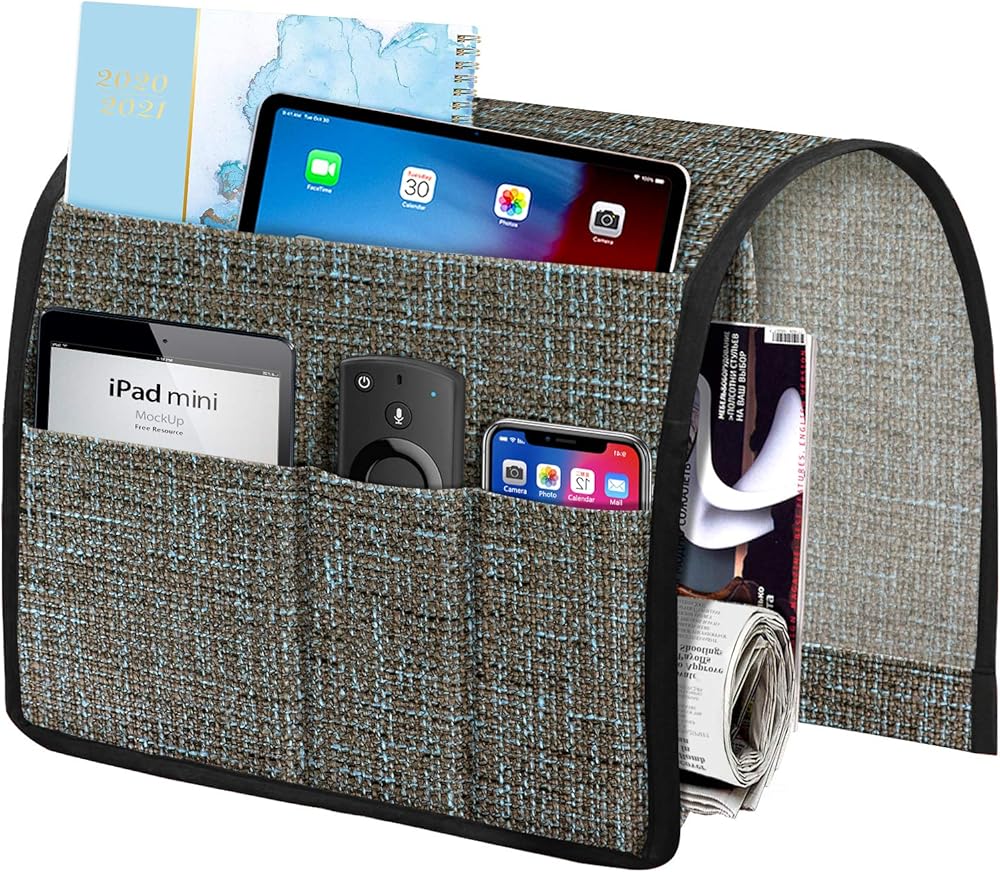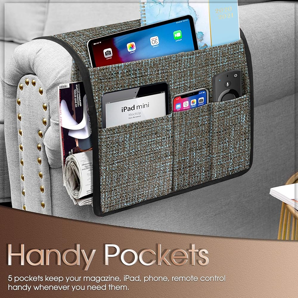 Joywell سميكة الكتان كرسي العلبة 5 جيوب حامل عن بعد على الأريكة وذراع الكرسي للتحكم عن بعد في التلفزيون، منظم مسند ذراع الأريكة للمجلات، والكتب، والهاتف الخليوي، آي باد، والقهوة
