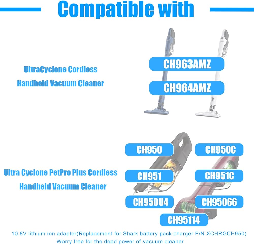 Never let a dead battery stop you from tackling pet hair again! This UL listed replacement charger is designed specifically fits for Shark CH950 CH950C CH951 CH951C CH950U4,CH95066,CH95114 Ultra Cyclone PetPro Plus Cordless Handheld Vacuum Cleaner, and CH963AMZ CH964AMZ UltraCyclone Cordless Handheld Vacuum Cleaner. Simply plug it in and watch your vacuum come back to life with its 14.4V lithium ion power.please note that it is not an OEM product but with OEM quality.