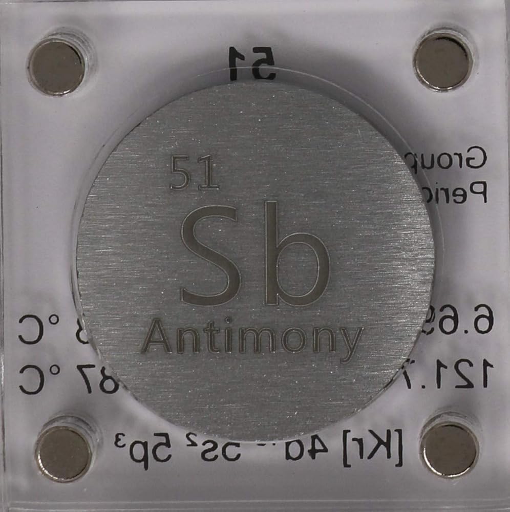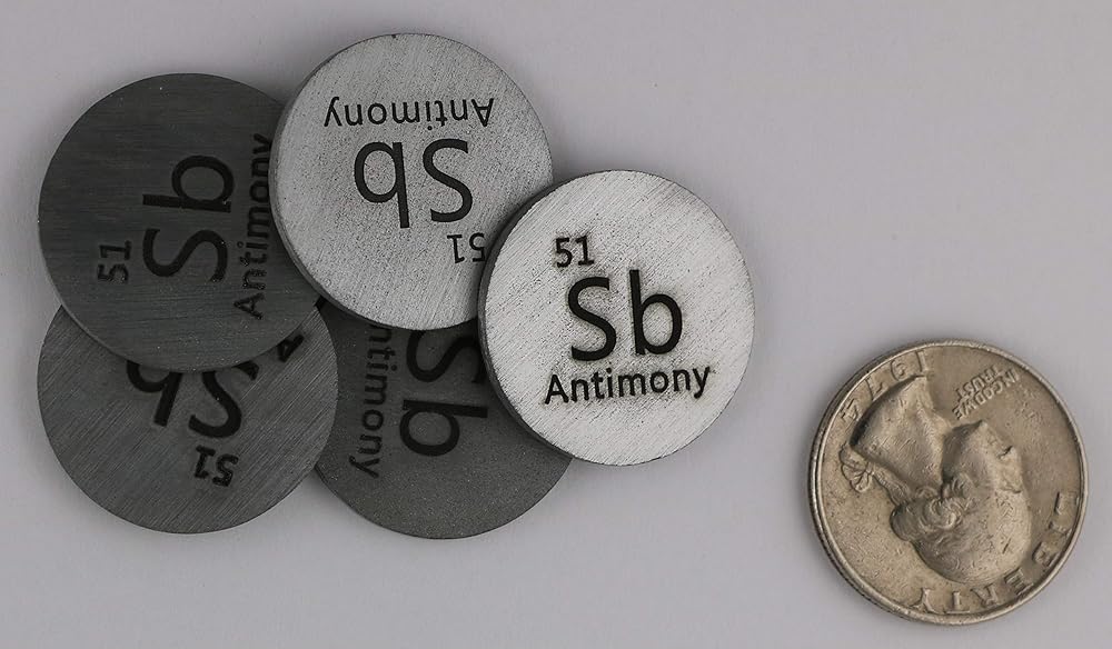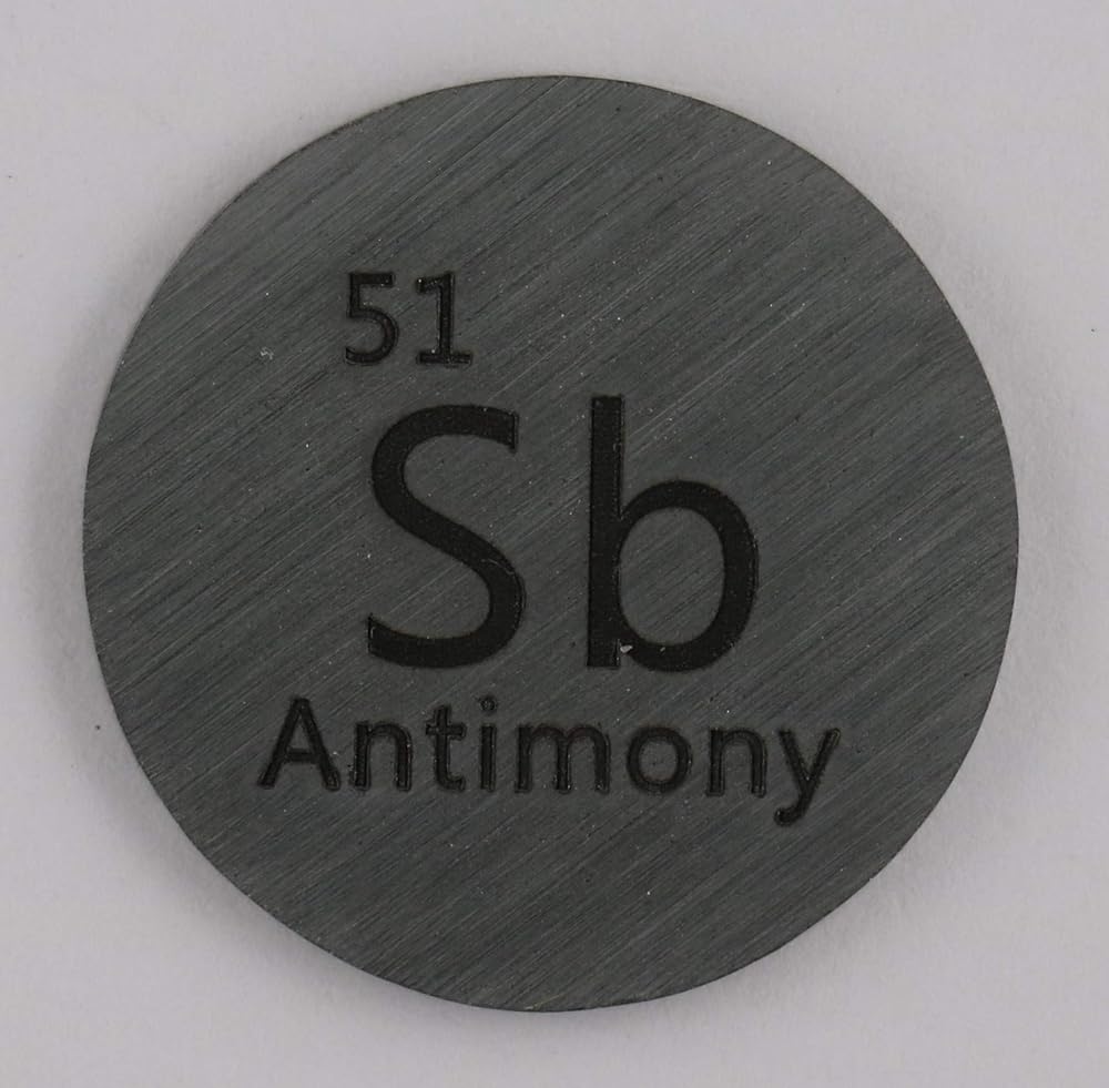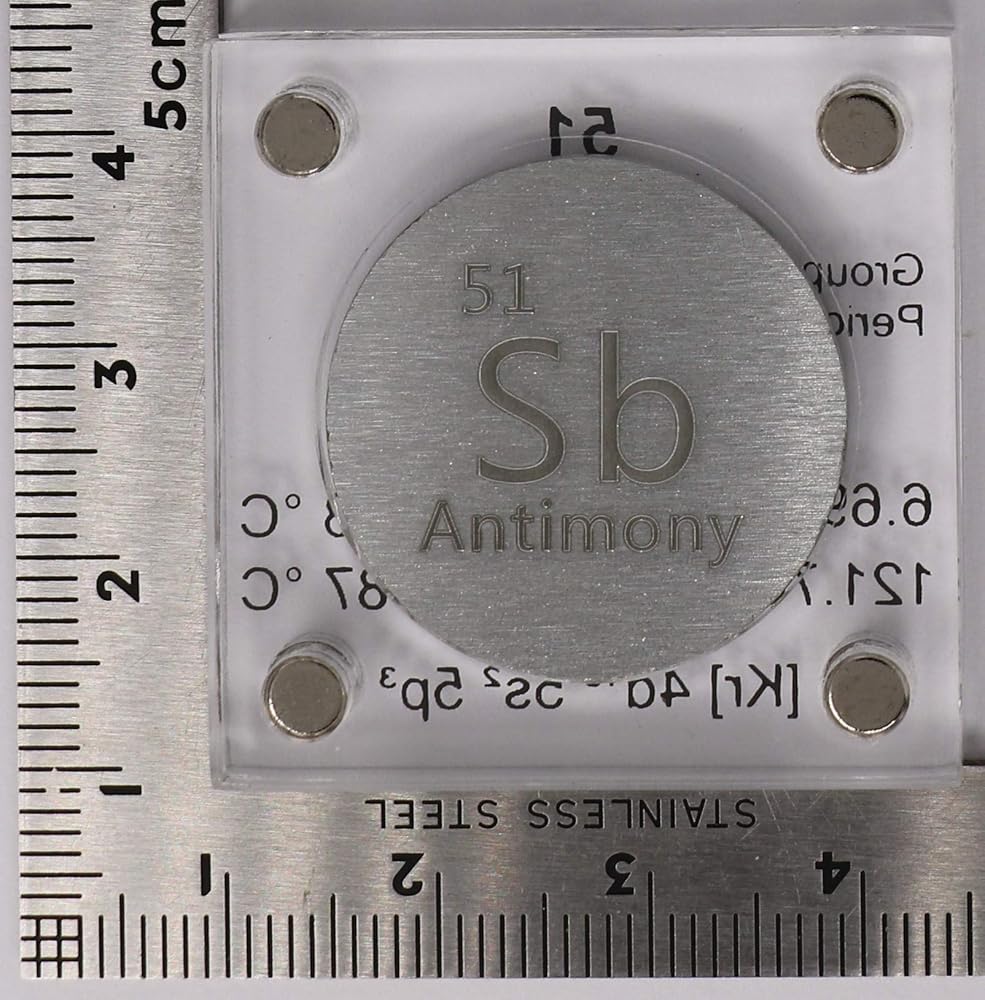 Antimony is a chemical element with symbol Sb (from Latin: stibium) and atomic number 51. A lustrous gray metalloid, it is found in nature mainly as the sulfide mineral stibnite (Sb2S3). The largest applications for metallic antimony is an alloy with lead and tin and the lead antimony plates in lead–acid batteries. Alloys of lead and tin with antimony have improved properties for solders, bullets, and plain bearings. Antimony compounds are prominent additives for chlorine and bromine-containing fire retardants found in many commercial and domestic products. An emerging application is the use of antimony in microelectronics. -Wikipedia - Scale and quarter not included