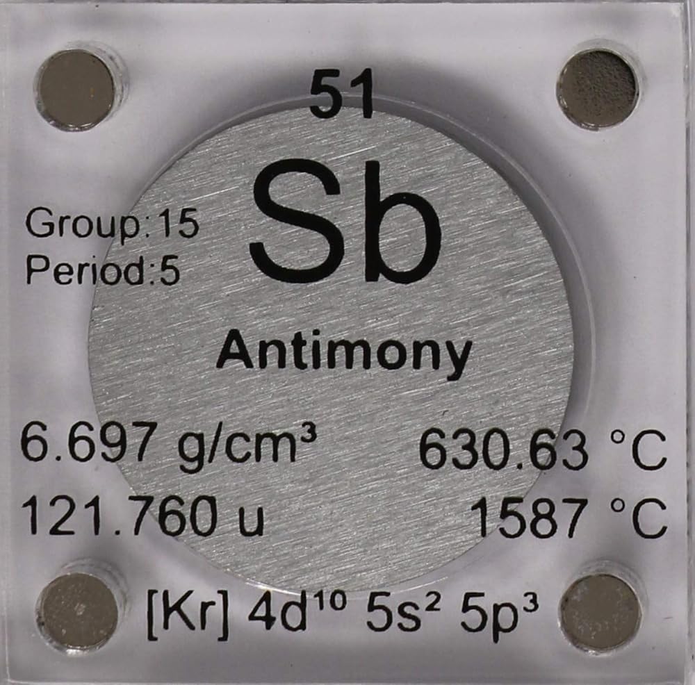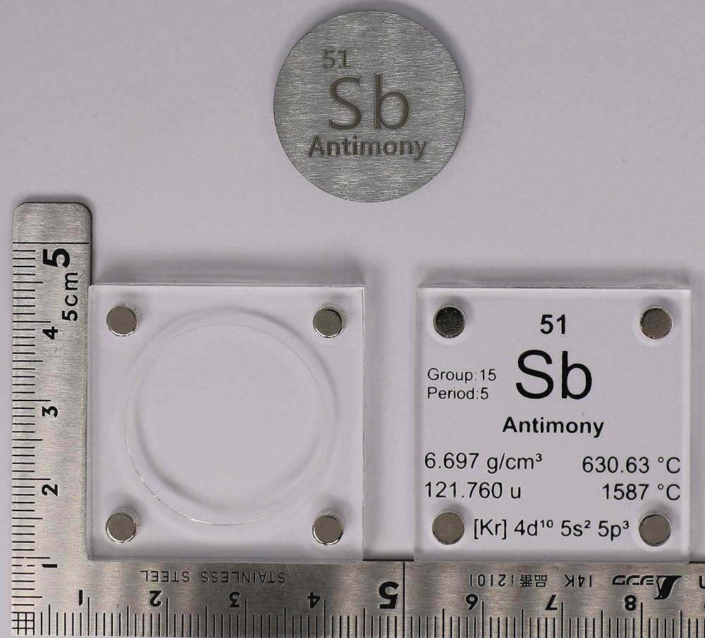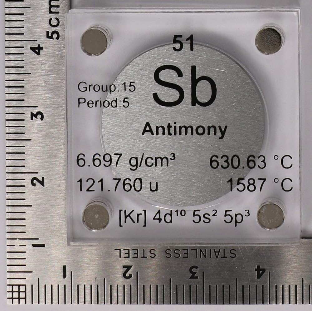 Antimony is a chemical element with symbol Sb (from Latin: stibium) and atomic number 51. A lustrous gray metalloid, it is found in nature mainly as the sulfide mineral stibnite (Sb2S3). The largest applications for metallic antimony is an alloy with lead and tin and the lead antimony plates in lead–acid batteries. Alloys of lead and tin with antimony have improved properties for solders, bullets, and plain bearings. Antimony compounds are prominent additives for chlorine and bromine-containing fire retardants found in many commercial and domestic products. An emerging application is the use of antimony in microelectronics. -Wikipedia - Scale and quarter not included