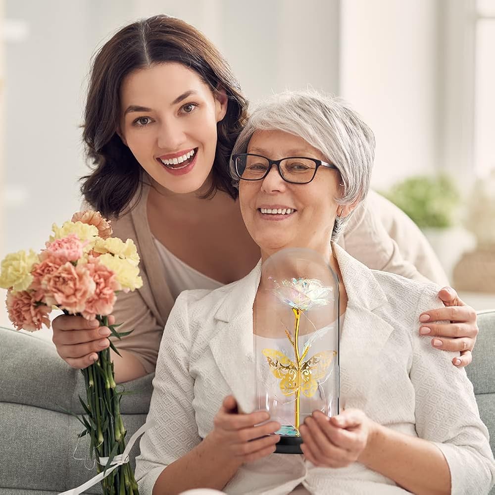 Mothers Day Rose Flower Gifts for her, Colorful Artificial Flower Galaxy Rose Gift, Light Up Gold Foil Rose Butterfly in Glass Dome, Unique Forever Rose Gifts for Mothers Day Valentines Anniversary