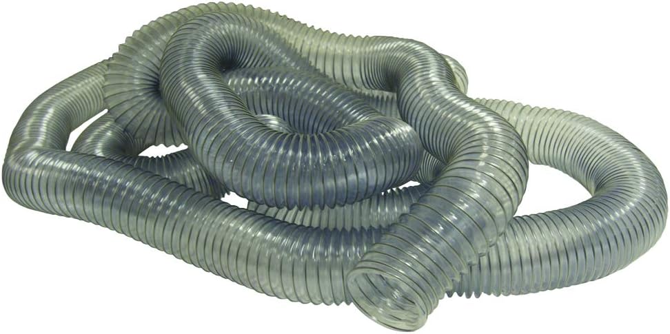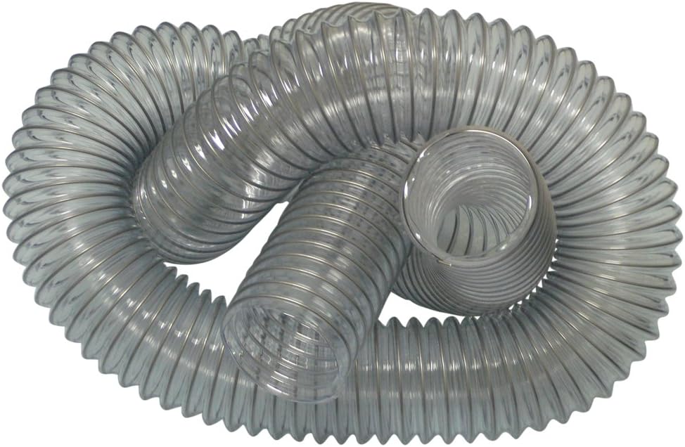 The "PVC Flexduct Light-Duty Clear" is a medium-weight clear PVC flexible hose reinforced with a spring steel wire helix for industrial air movement and fume control applications. These commercial flexible hoses provide great flexibility with tight bending characteristics and offer good chemical and dampness resistance. This flex ductwork is great for applications where ventilation and flexibility are a must. PVC hose material is an amorphous polymer and as a result its basically transparent. PVC flex hoses are non-transparent when they are manufactured using compounding agents. Since the main chain of the polymer is made by single bonds of carbon atoms, PVC has excellent chemical resistance. The "PVC Flexduct Light-Duty Clear" light-duty flex hose has a working temperature range from -20 to 160+ Fahrenheit. These commercial hoses are manufactured with FDA acceptable materials that can be used in food processing, pharmaceutical, and health care applications. PVC has polar groups (chlorine), and is amorphous, therefore mixes well with various other substances. This makes for a chemically stable flex duct. This flexible hose exhibits excellent flexibility and compressibility. In larger ID sizes it has up to a 6 to 1 compression ratio, meaning a 12 foot length can compress down to 2 feet. In addition the smaller sizes of this hose (2.25" and below) can handle a full vacuum at 29 Inch/Hg. Please refer to the product specification guide for exact information regarding the ID size you are considering. The "PVC Flexduct Light-Duty Clear" are general-purpose collections ducts that are available in internal diameter sizes from 1.25" up to 24" ID. These are also available in metric sizes. These air, dust and light material collection ducts are available in clear in standard 12.5 ft and 25 ft sections and come with plain cut ends.